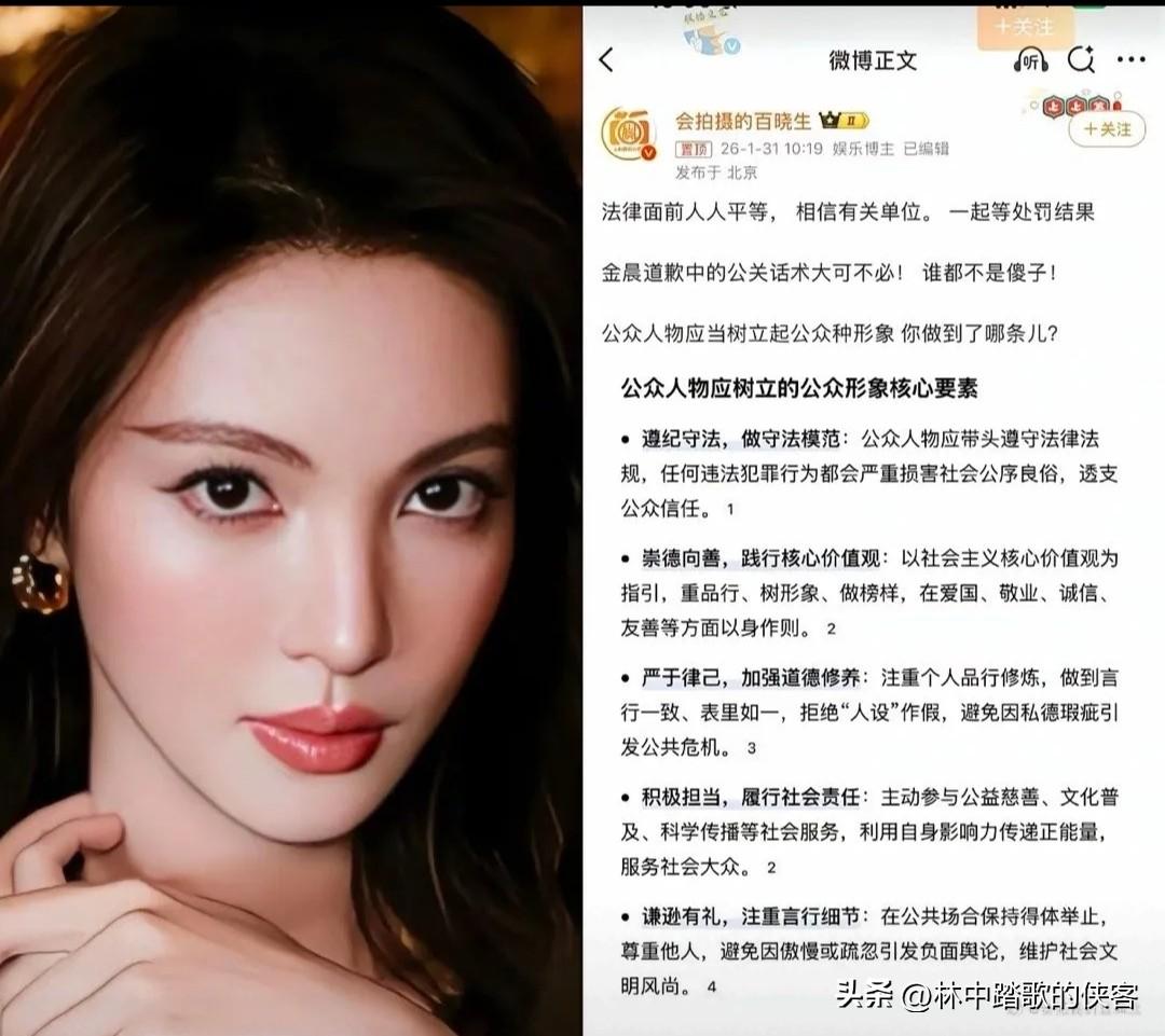 利益这面镜子一照,人心就歪了! 狗仔死咬着金晨不放, 还二度喊话,说到底就俩心思。一是攥着绍兴车祸的认定书、聊天记录这些实料,去年谈封口费没谈拢,专挑她官宣代言、备战春晚的节点爆料,纯纯报复性搞事。 二是盯着流量不放,揪着认定书没提避狗、助理顶包这些点追着锤,哪怕警方出了通报,还揪着道歉文喊话术,无非是靠这波热度涨粉涨关注。 说白了,哪里是啥监督真相,就是把金晨的事业当筹码,拿爆料换利益,吃相是真难看。