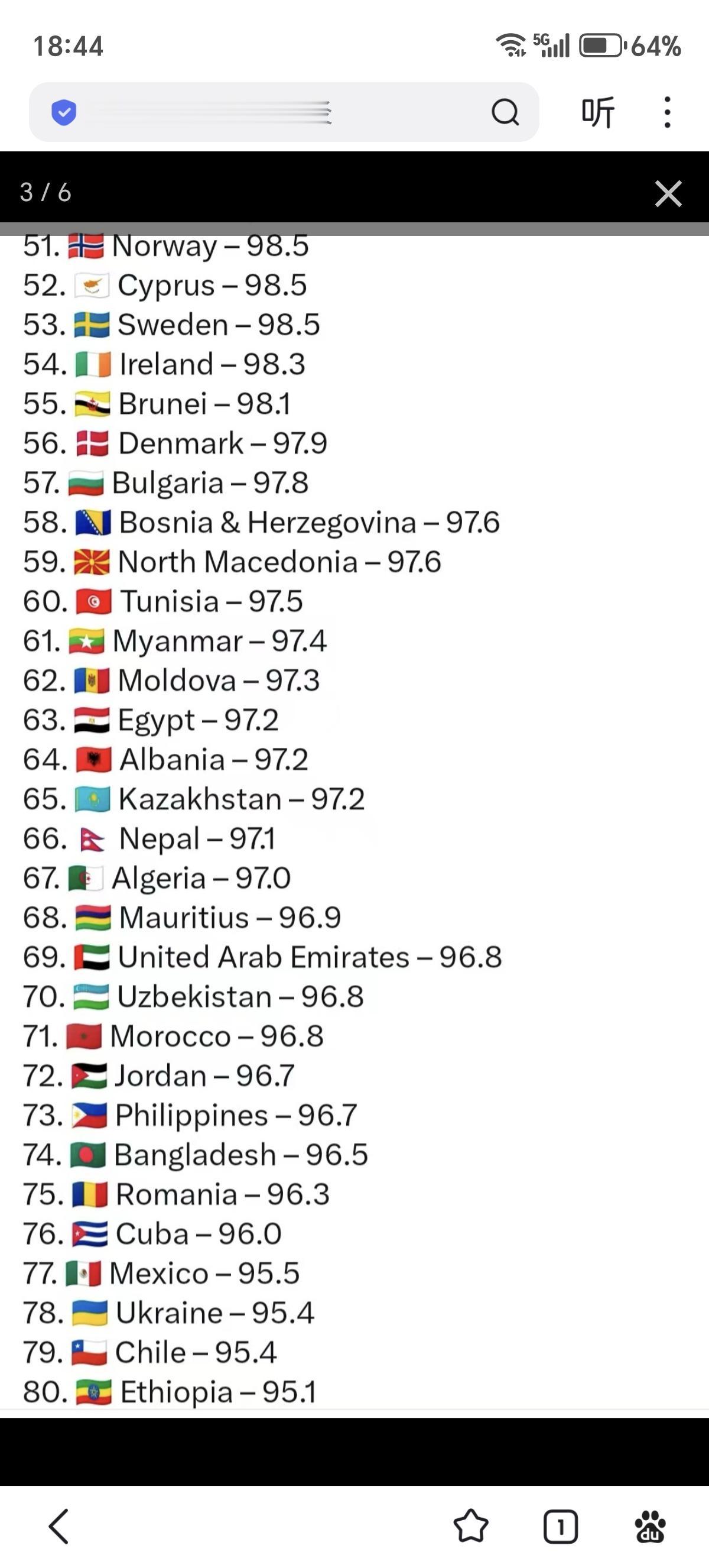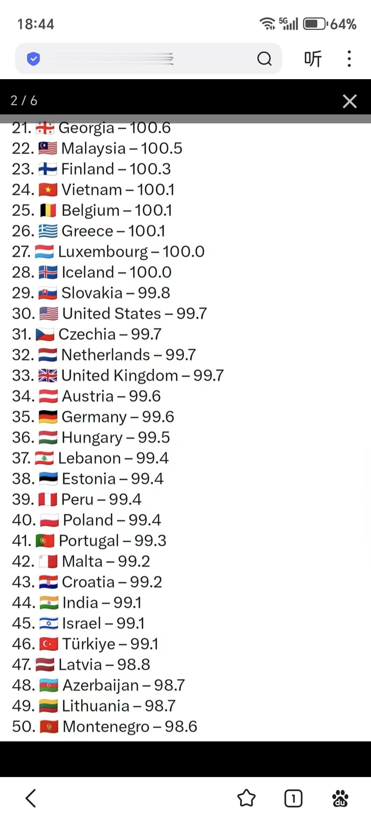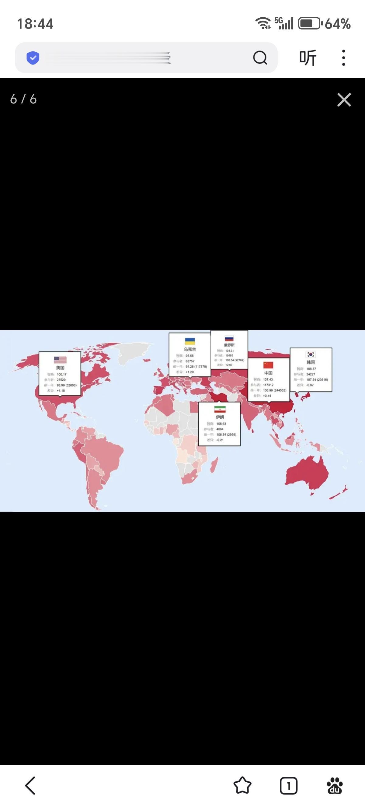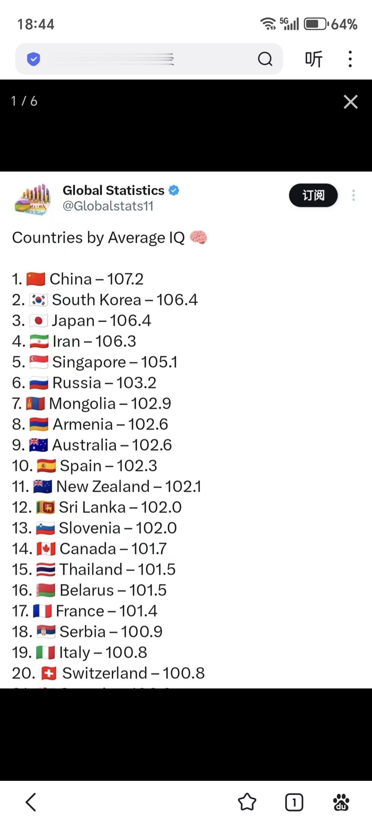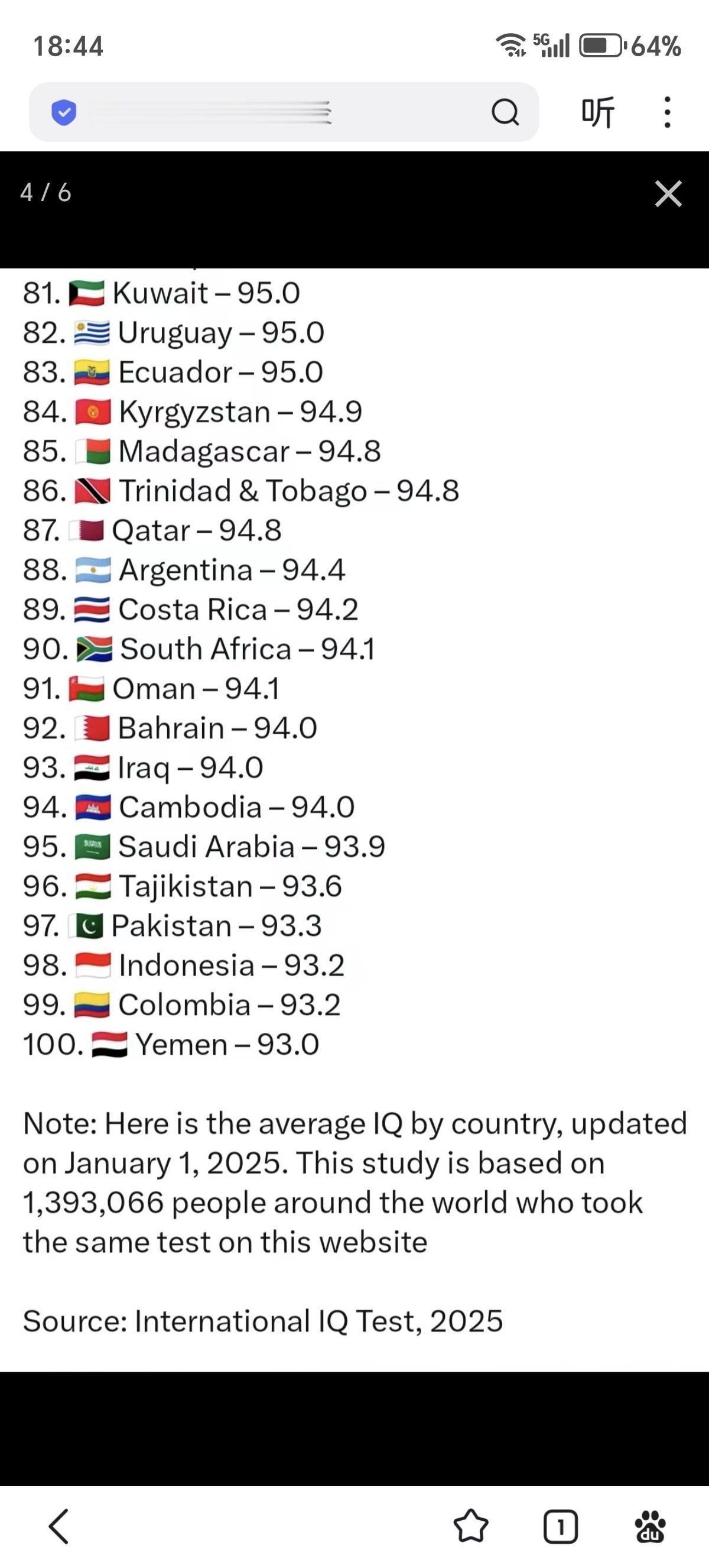 2025年1月1日更新的各国平均智商前100位的列表。这项研究是基于世界各地的139万3066人在国际智商测试网站上做了同样的测试所得出的结论。中国排第1位,俄罗斯排6位,法国排第17位,美国排第30位,英国排第33位,德国排第35位,印度排第44位。