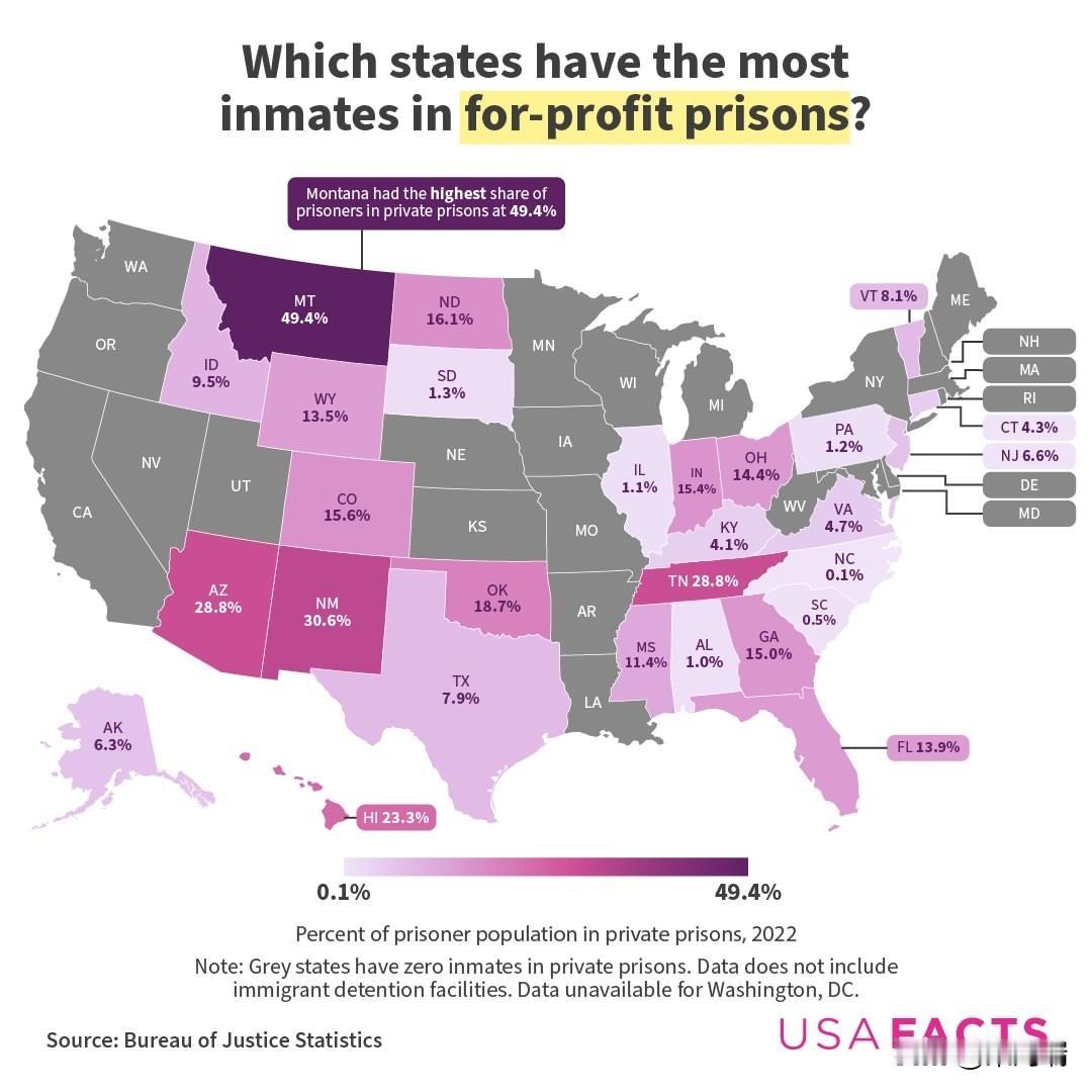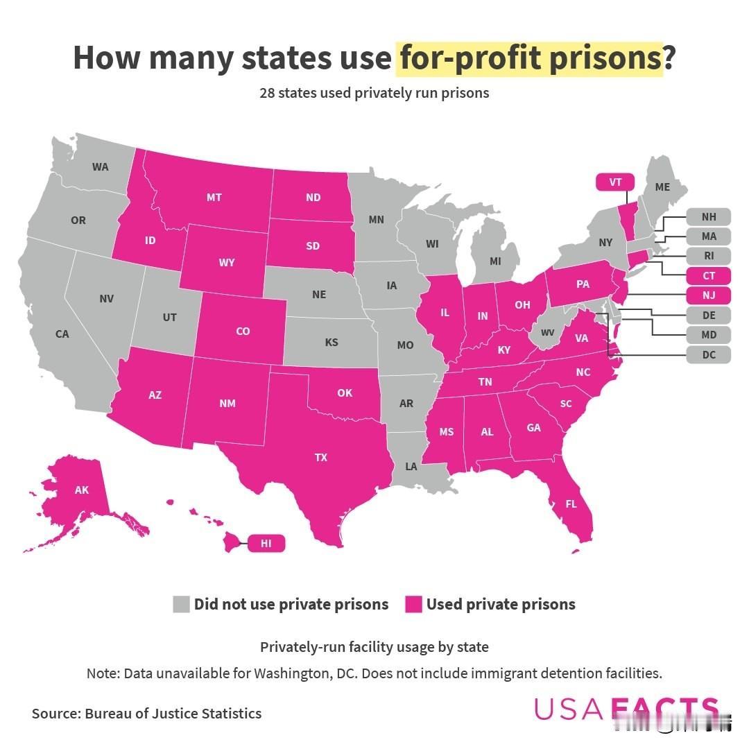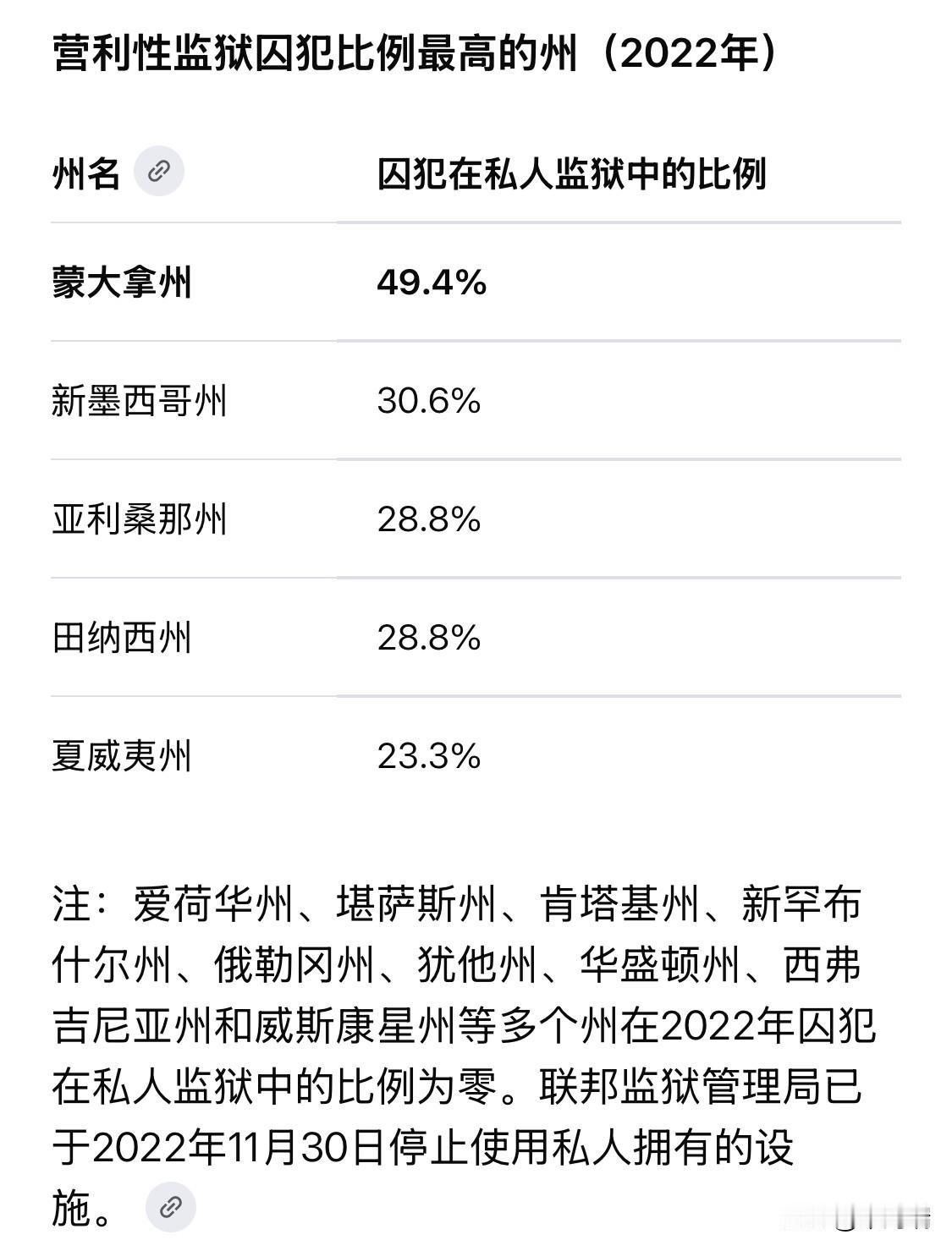 截至 2025 年和 2026 年初的最新统计数据,美国监狱系统由数千个不同层级的机构组成,关押着约 200 万 名囚犯。 1. 美国监狱及拘留设施数量 根据 Prison Policy Initiative 的 2025 年报告,美国主要的惩教设施分布如下: 州监狱 (State Prisons):1,566 座 联邦监狱 (Federal Prisons):98-102 座 地方看守所 (Local Jails):3,116 个 青少年管教所 (Juvenile Correctional Facilities):1,277 个 其他设施:包括 133 个移民拘留所、80 个原住民看守所以及军事监狱和州立精神病院等。 2. 私营监狱的比例 私营监狱在美国惩教体系中占据特定比例,但近年来在联邦层级已逐步削减: 关押比例:截至 2023 年至 2025 年的统计,约有 8% 的州和联邦囚犯(约 9.6 万至 13 万人)关押在营利性私营监狱中。 私营监狱数量:全美约有 100 余座 私营监狱,主要由 CoreCivic (原 CCA) 和 GEO Group 两大巨头运营。 地区差异: 联邦层级:拜登政府已通过行政命令要求司法部不再续签私营监狱合同,因此联邦系统中的私营比例已大幅下降。 州层级:各州差异显著。全美有 28 个州仍在使用私营监狱,其中 蒙大拿州 (Montana) 的比例最高,近 50% 的囚犯关押在私营设施中。 3. 主要运营巨头 CoreCivic (原 CCA):全美首家私营监狱公司,在 20 多个州拥有超过 50 座设施。 GEO Group:与联邦移民和海关执法局 (ICE) 等机构有深度合作。