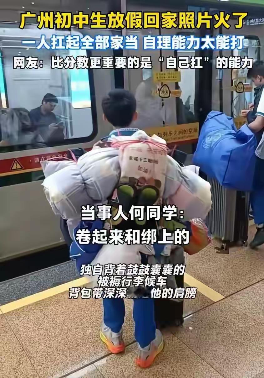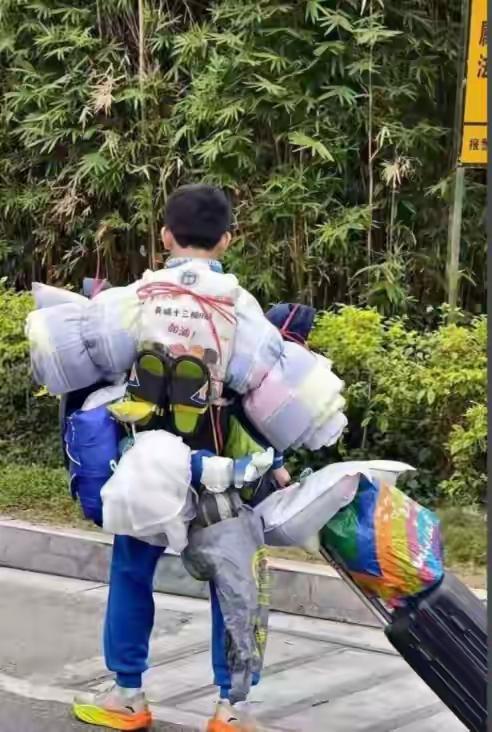 寒假的闹钟还没把校园叫透 何梓睿的灯已亮在清晨六点后 被褥、蚊帐摊成“待整理版图” 他捏着绳子,像研究战术的小参谋 “重的压箱底,轻的往背上扣” 先把书架固定成“随身小宇宙” 再用绳子绕着书包打个十字扣 蚊帐裹成卷,塑料袋挂得溜溜 室友凑过来搭把手“稳住!别抖” 二十分钟后,他变身“移动山丘” 校服裹着“小山包”,轱辘箱在前头 脚步噔噔响,像奔赴“回家关口” 爸妈说“开车来接,不用你扛走” 他摆摆手“我能搞定,这点重量够不够?” 步行到地铁站,人流里稳稳走 换乘时扶着扶手,“装备”没晃半宿 终于到终点,爸爸笑着迎门口 他卸下行李,抹把汗还咧嘴瞅 “你看,没让帮忙吧!”语气超得瑟 上学期背竹席的事儿,又想拿出来秀 这就是黄埔校园的“独立小能手” 把打包行李,活成了成长的小成就 不是温室里的花,是敢扛事儿的后 网友点赞:“这娃的底气,比成绩更牛!” 这才是21世纪的少年[赞][加油]