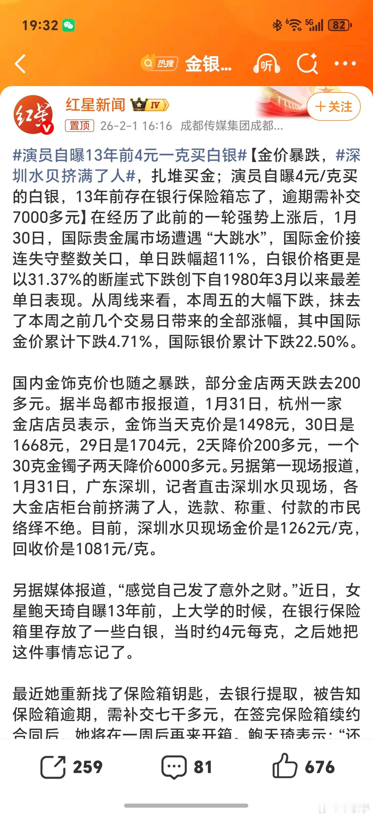 30年前黄金80一克女子囤了几公斤这种还是少数,而且30年前的80元也不等同今天的80元,不过多数受众群体更喜欢这类新闻叙事!演员自曝13年前4元一克买白银