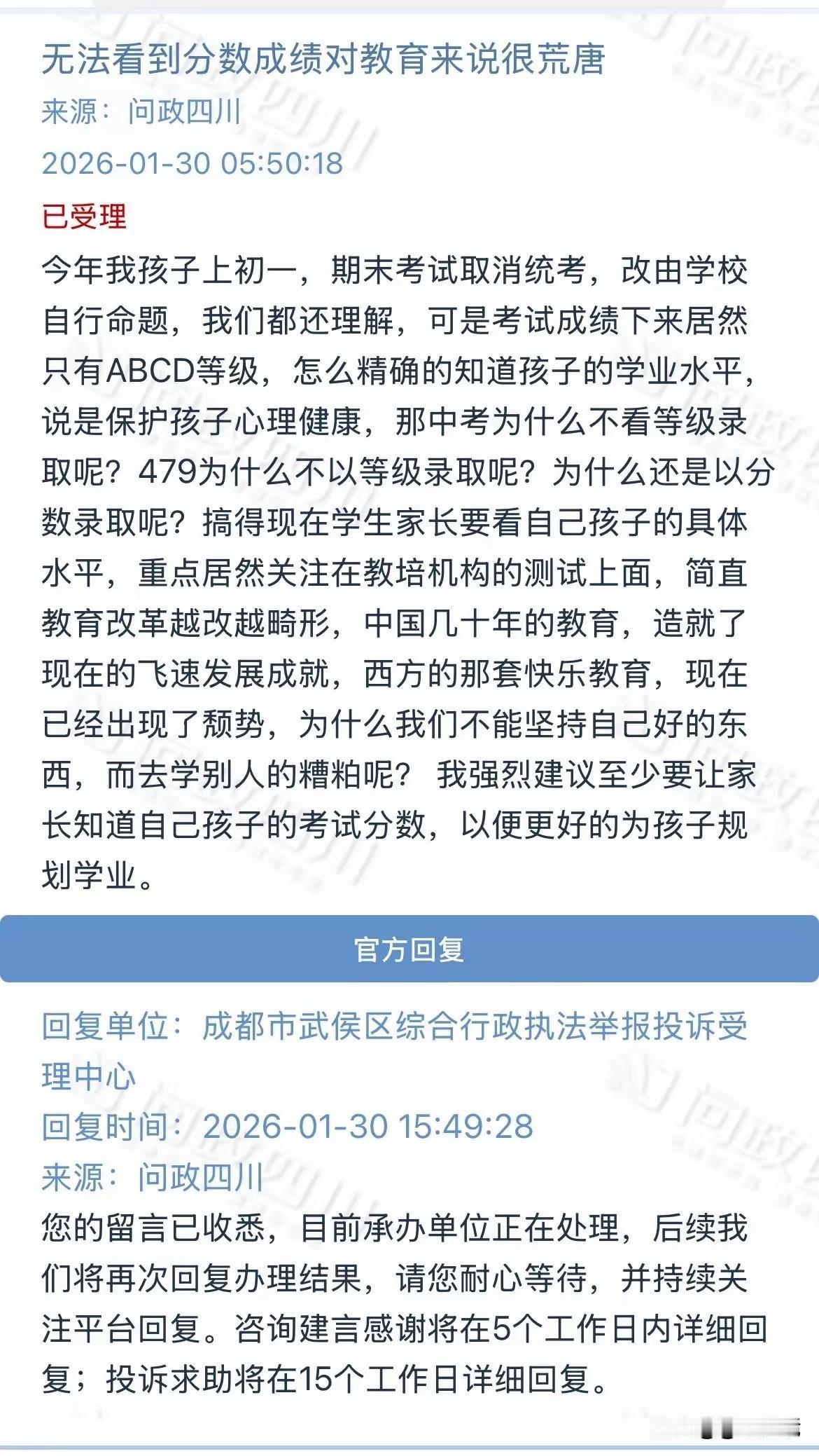 “无法看到分数成绩对教育来说很荒唐!”四川一位家长在问政四川的投诉,引发网友热议。孩子读初一,期末取消统考改校内命题,这都能理解。可成绩只划ABCD等级,美其名曰保护孩子心理健康,可无法准确知道孩子的成绩。中考为什么不看等级录取呢?479为什么不以等级录取呢?录取看的还是实打实的分数啊!这下好了,想摸清孩子真实学业水平,只能转头去教培机构找测试,强烈建议至少要让家长知道自己孩子的考试分数,以便更好的为孩子规划学业。 这事传到网上后,网友们也吵翻了天。有人吐槽:“自欺欺人,等级能看出啥差距?”。 也有人无奈附和:“可不是嘛,我家娃的分数,还是托关系才从老师那问到的”。 看完这位家长的投诉,恰恰暴露了当下教育改革与家长的困惑偏差,“等级制”和“分数录取”的脱节,才是让家长焦虑的根源。屏蔽分数看似保护了孩子,实则斩断了家长了解学情的渠道。 咱们不是反对保护孩子心态,可也不能一刀切地屏蔽分数。适当公开具体成绩,帮家长摸清孩子学业短板,才能真正帮孩子做好学业规划。#寻美三湘# #长沙新朋友#
