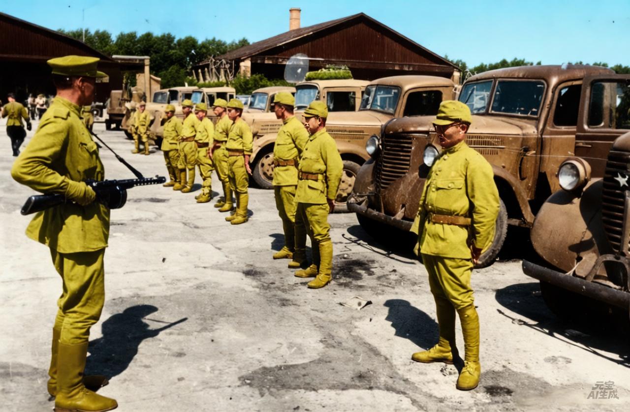 1945年的东北,苏军持枪看守已经投降的日本关东军汽车兵和大批的日本军车。这些汽车将被运回苏联。 此时这些小日本似乎还没有认识到问题的严重性。 不久他们将开启地狱模式,全部被送往西伯利亚挖土豆滴干活去了。
