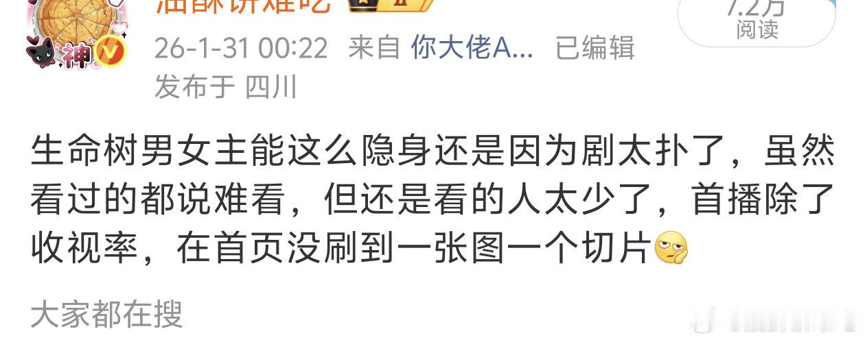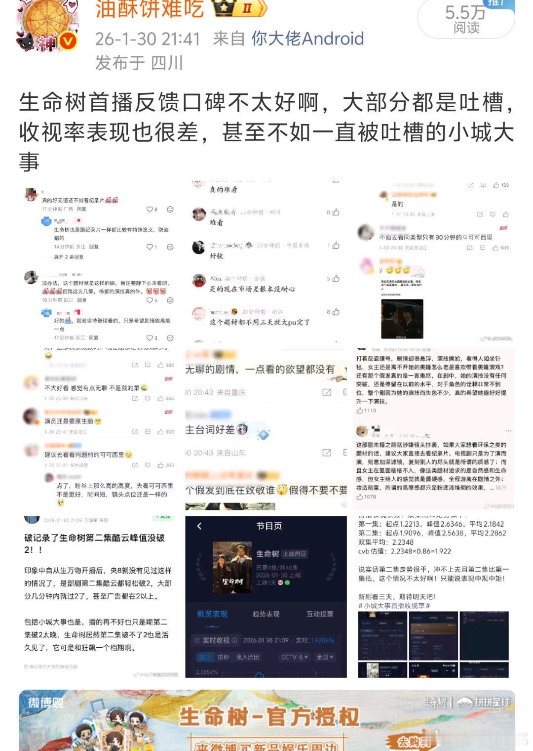 生命树首播反馈口碑不太好啊,大部分都是吐槽,收视率表现也很差,甚至不如一直被吐槽