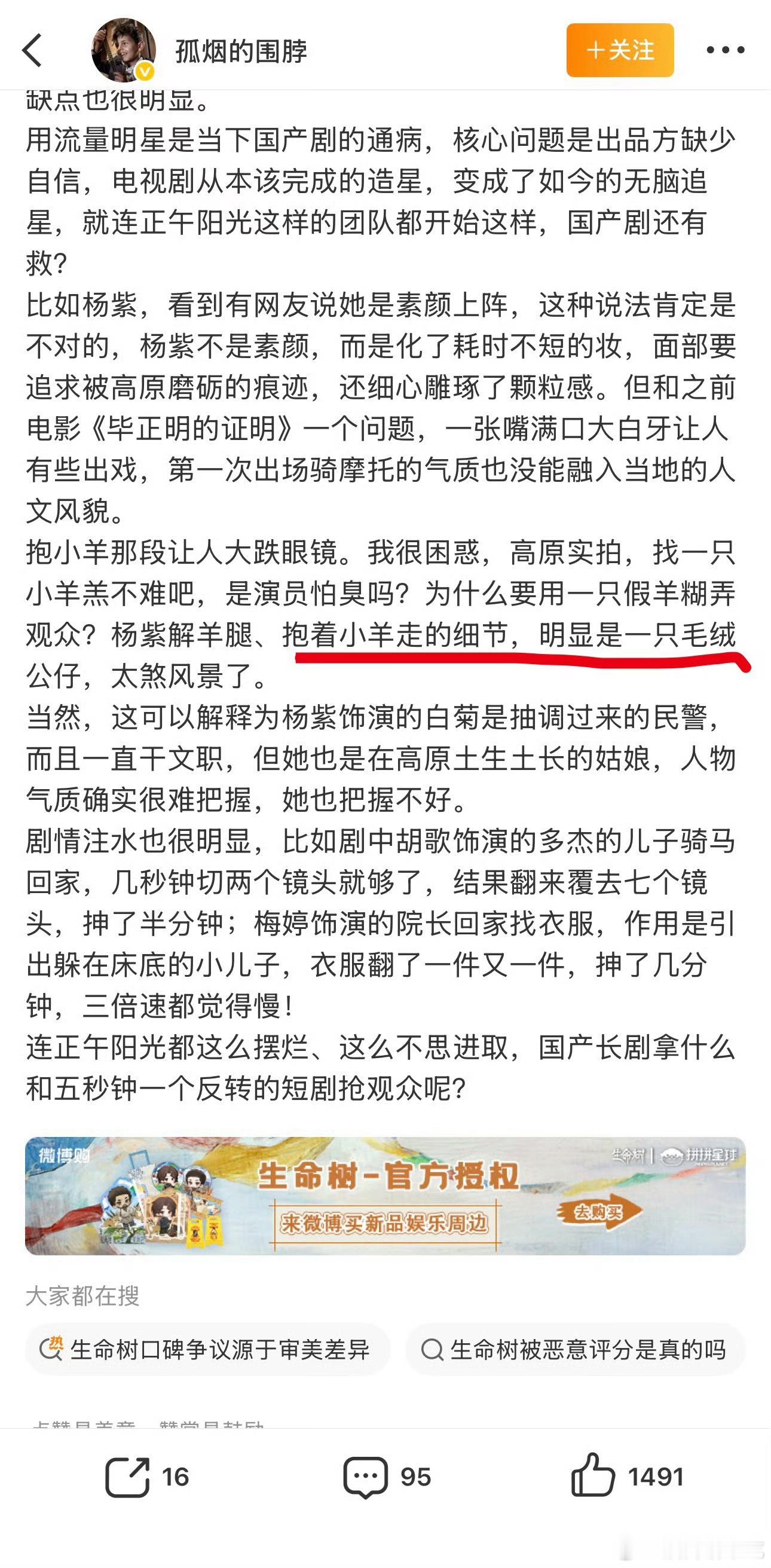 一篇很用心的生命树剧评,一看就认真看剧了,演员没把握住角色内涵,用偶像剧方式对待角色,剧情逻辑不行 生命树云合