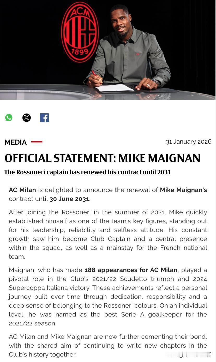 续约完成!AC米兰队长迈尼昂已续约至2031年,米兰俱乐部高兴的宣布迈克·迈尼昂的合同已续签至2031年6月30日。多位米兰名宿都恭喜了迈尼昂的续约,同时多位米兰球员也发推表示很激动迈尼昂留在米兰的决定。 之前加比亚、莱奥都在社交媒体喊话迈尼昂,希望迈尼昂能与球队完成签约,刚刚加盟米兰俱乐部的莫德里奇与拉比奥特也在社交媒体表达过迈尼昂是米兰防线绝对的领袖,他应当留在米兰。米兰俱乐部主教练阿莱格里第一时间表示可以拥有迈尼昂对于任何一位教练而言都是令人兴奋的事情。 迈尼昂之前代表AC米兰俱乐部出场188次,在球队2021/22赛季意甲冠军和2024年意大利超级杯冠军的征程中发挥了至关重要的作用。这些成就体现了他多年来通过奉献、责任感和对AC米兰的深厚归属感而不断积累的个人成长历程。米兰俱乐部将与迈尼昂携手未来去争取更多的荣誉。