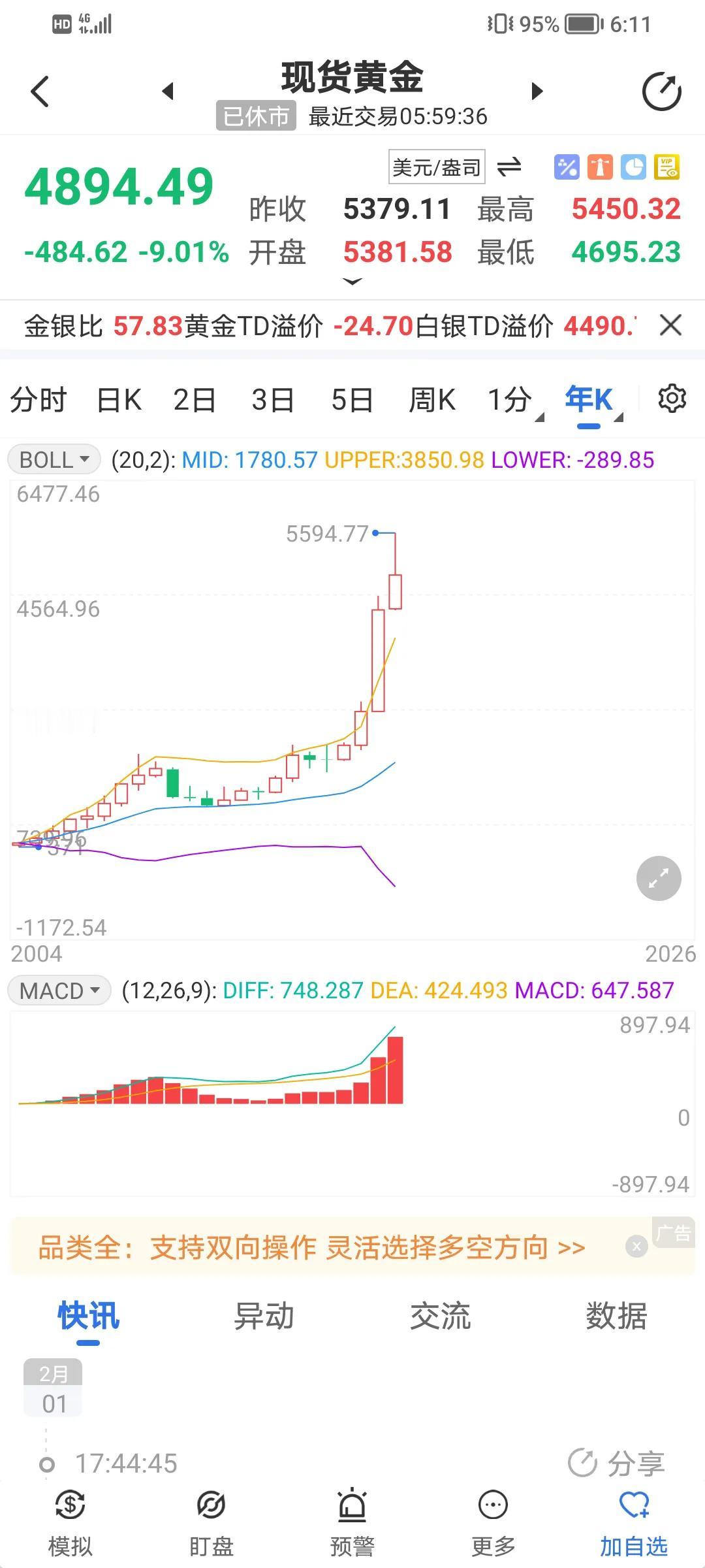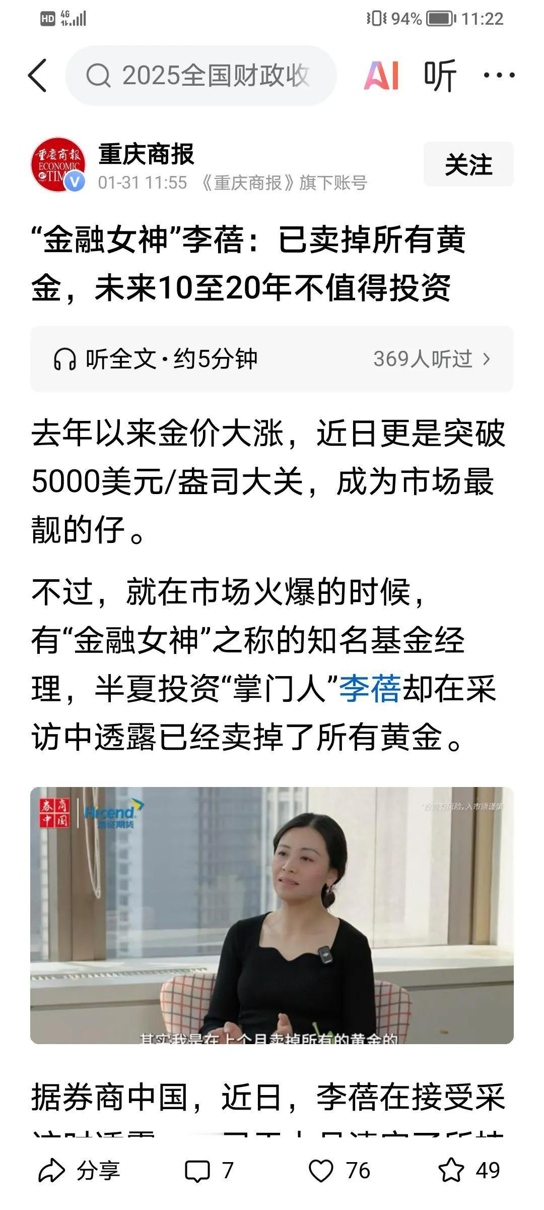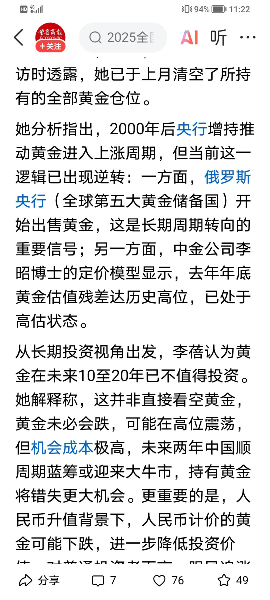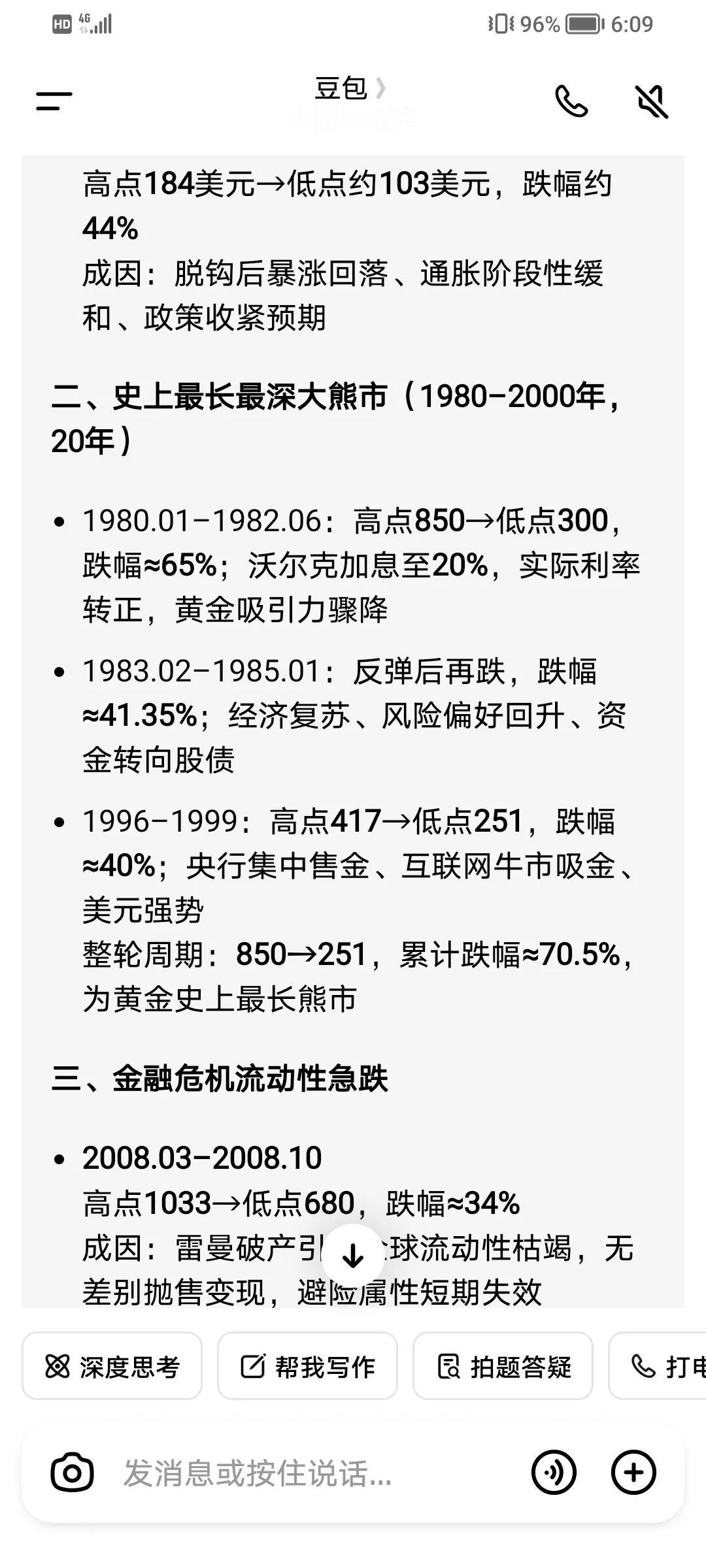 摊牌了,被她的“警世良言”打败了,我已经对持仓黄金失去了信心。 今日看到一篇新闻,说金融女神"李蓓已卖掉所有黄金,她还提醒大家未来10至20年不值得投资黄金。 我赶紧查询了现货黄金年K曲线,由于时间有点久远,截图四仅显示了2004年以后近二十一年的走势曲线,发现确实是一段大级别的牛市,正如李蓓分析指出,2000年后央行增持推动黄金得以进入上涨周期。 再查了资料,看到在1980-2000年20年间,黄金经历了一次深度回调,累计跌幅达到70.5%。 所以此次黄金经历了20多年的上涨,也有必要再一次经历20年的深度回调。 所以我坚决卖出黄金,不想后悔20年。