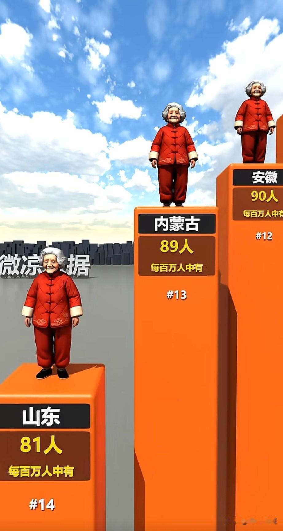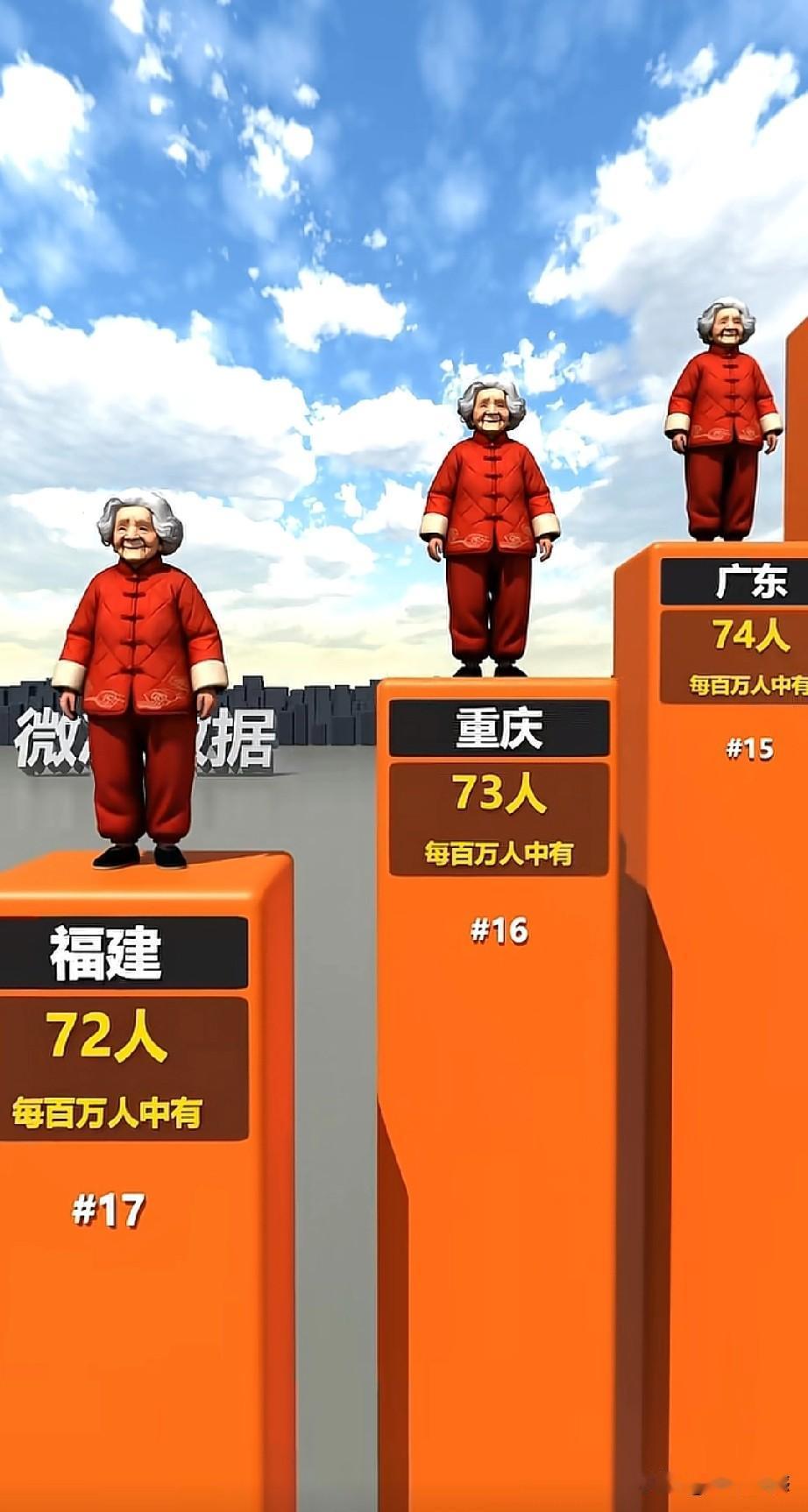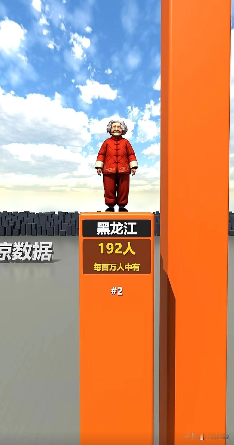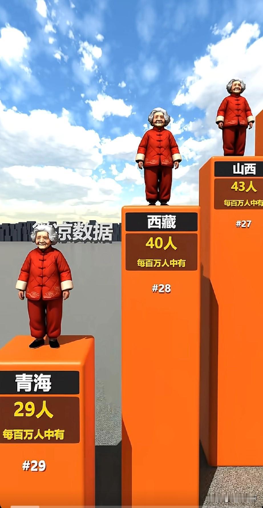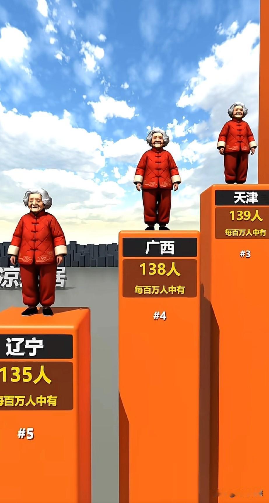全国各省百万人口中百岁老人最多的省份是海南,每百万人口中,有百岁老人272人,第二名是黑龙江,每百万人口中,有百岁老人192人,第三名是天津,每百万人口中,有百岁老人139人,第四名是广西,138人,第五名是辽宁,135人,六名是上海,130人,第七名是北京127人,第八名是吉林,106人,是四川102人,第十名是河南,99人。真没有想到,东北三省竟然排在了前十名!
