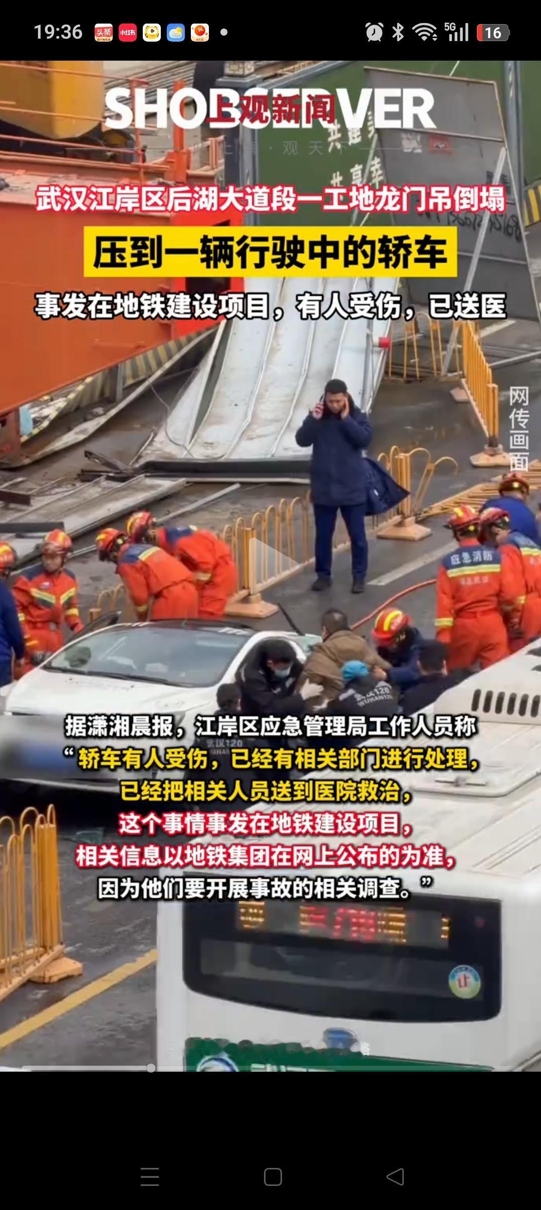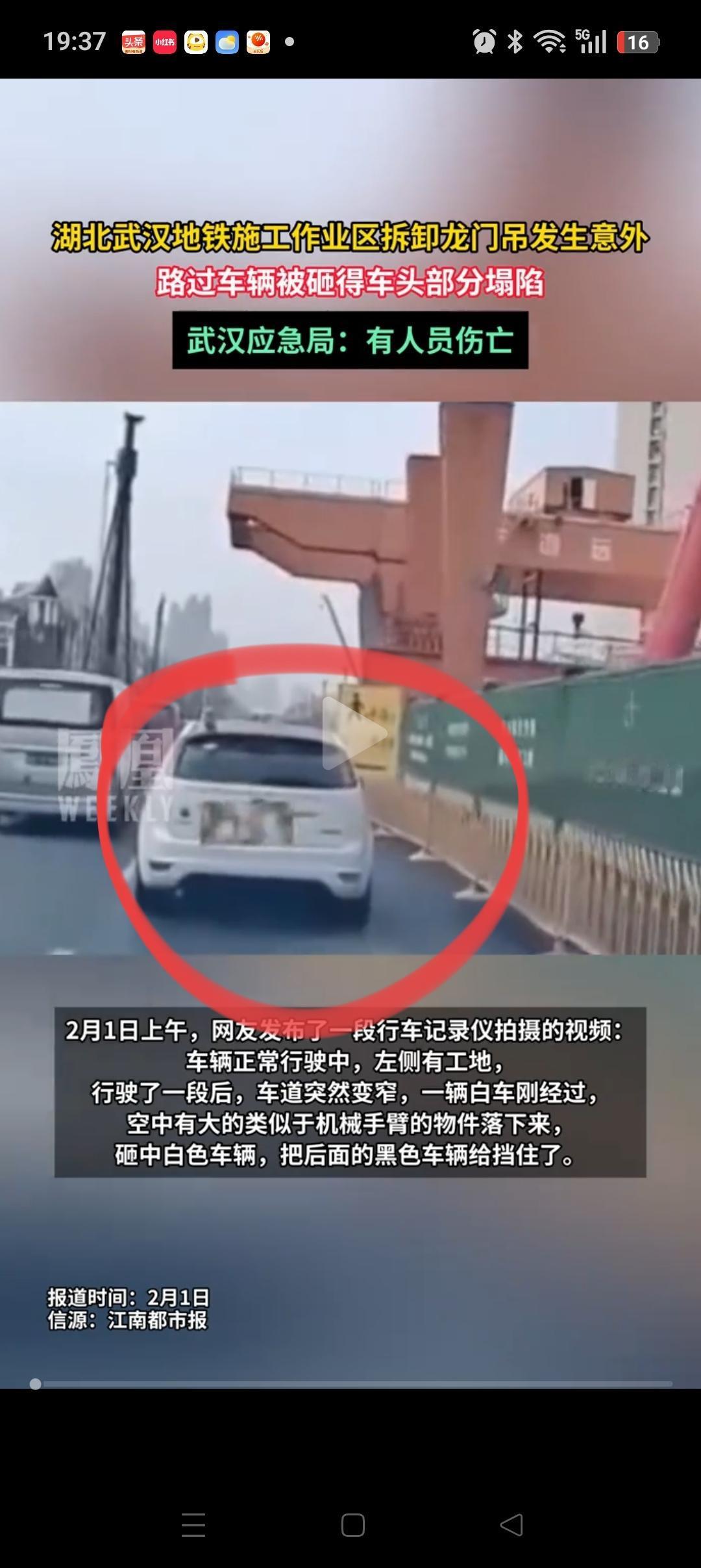 武汉一地铁施工区龙门吊倾倒, 这辆白色小车也挺倒霉的! 事发区域本来是双车道,因为施工,那一块正好变成了单车道。 本来它以正常速度过去,是可以冲过去的。只可惜因为是单向车道,它的速度降低了,正好砸到了车尾,就差那0.01秒。 但凡快一点点都没事了啊[流泪] 不过即使这辆白色躲过去了,这辆黑车也可能被砸到。 因为这种一瞬间的事,确实是想躲也躲不过去,纯粹是看运气。 只希望我们的施工方一定要做事严谨一些,发生这种事属实不应该[祈祷][祈祷]