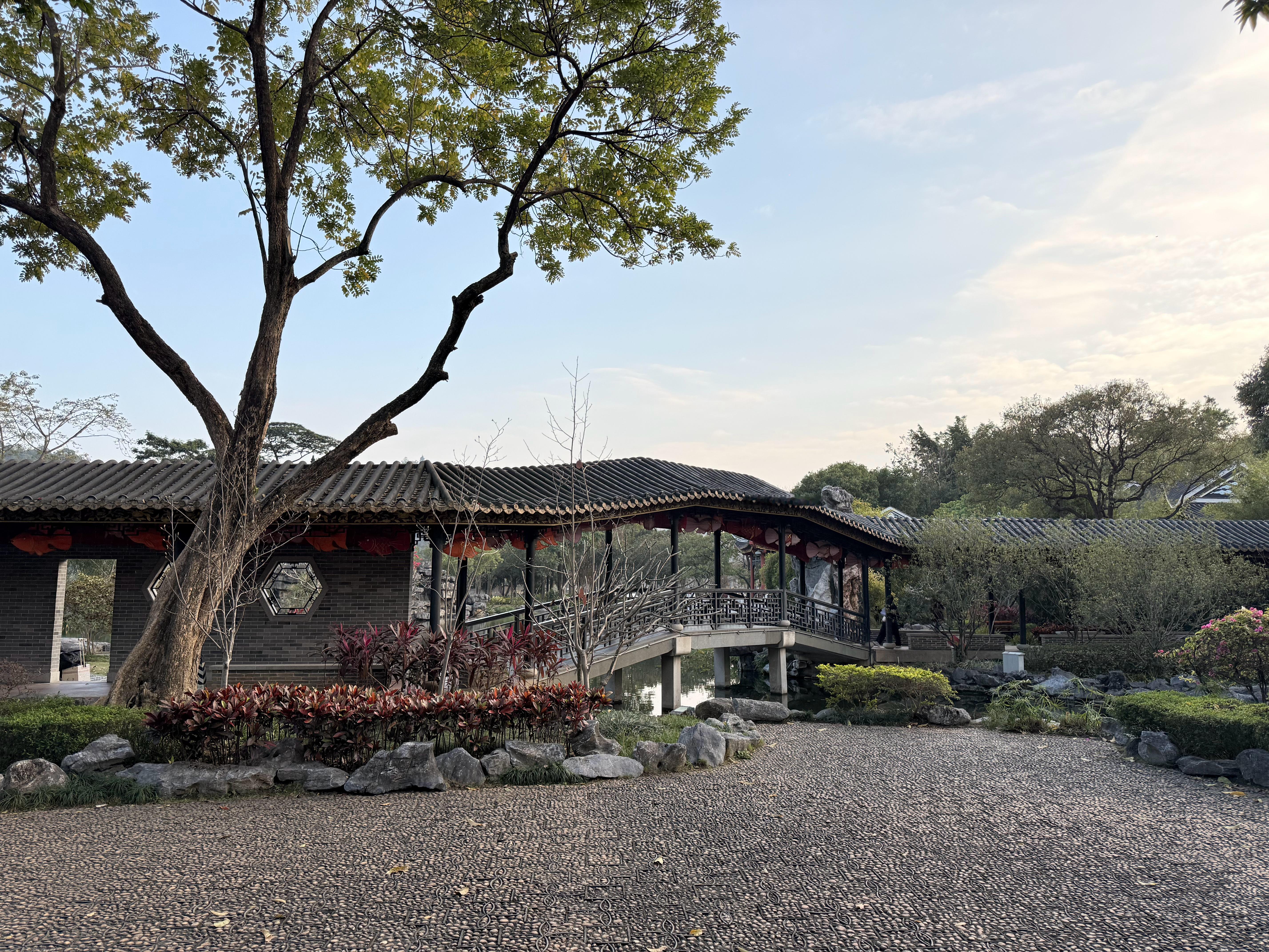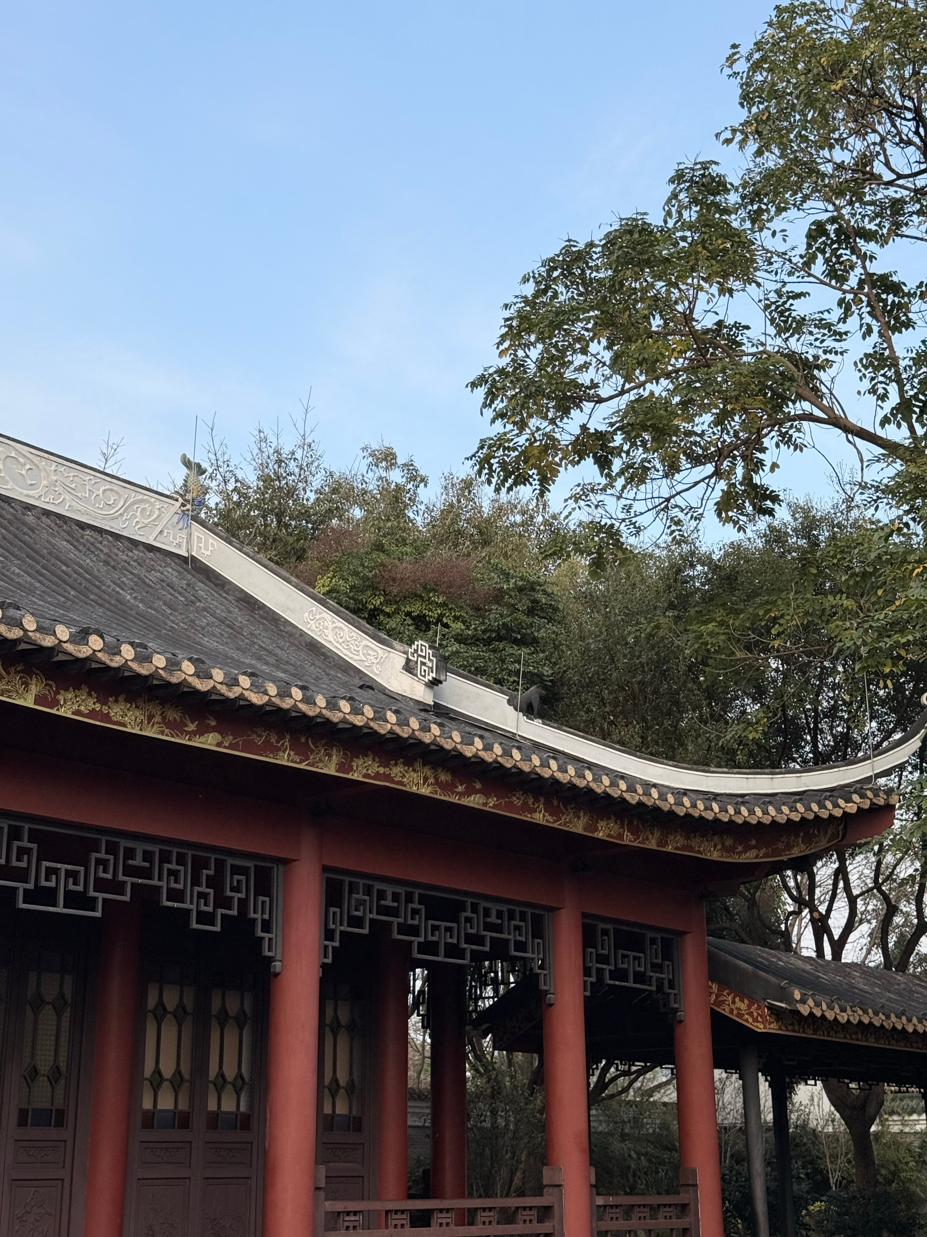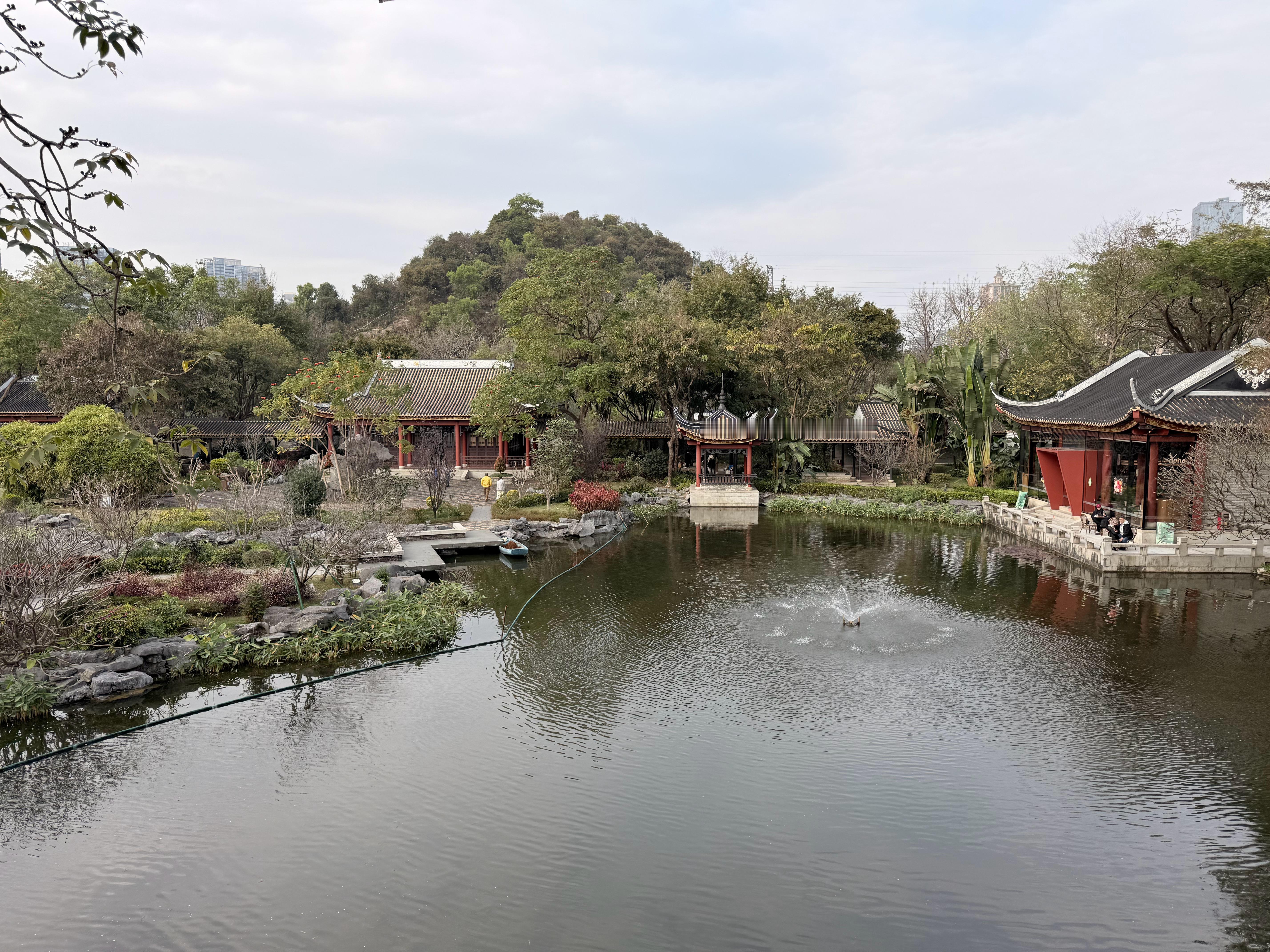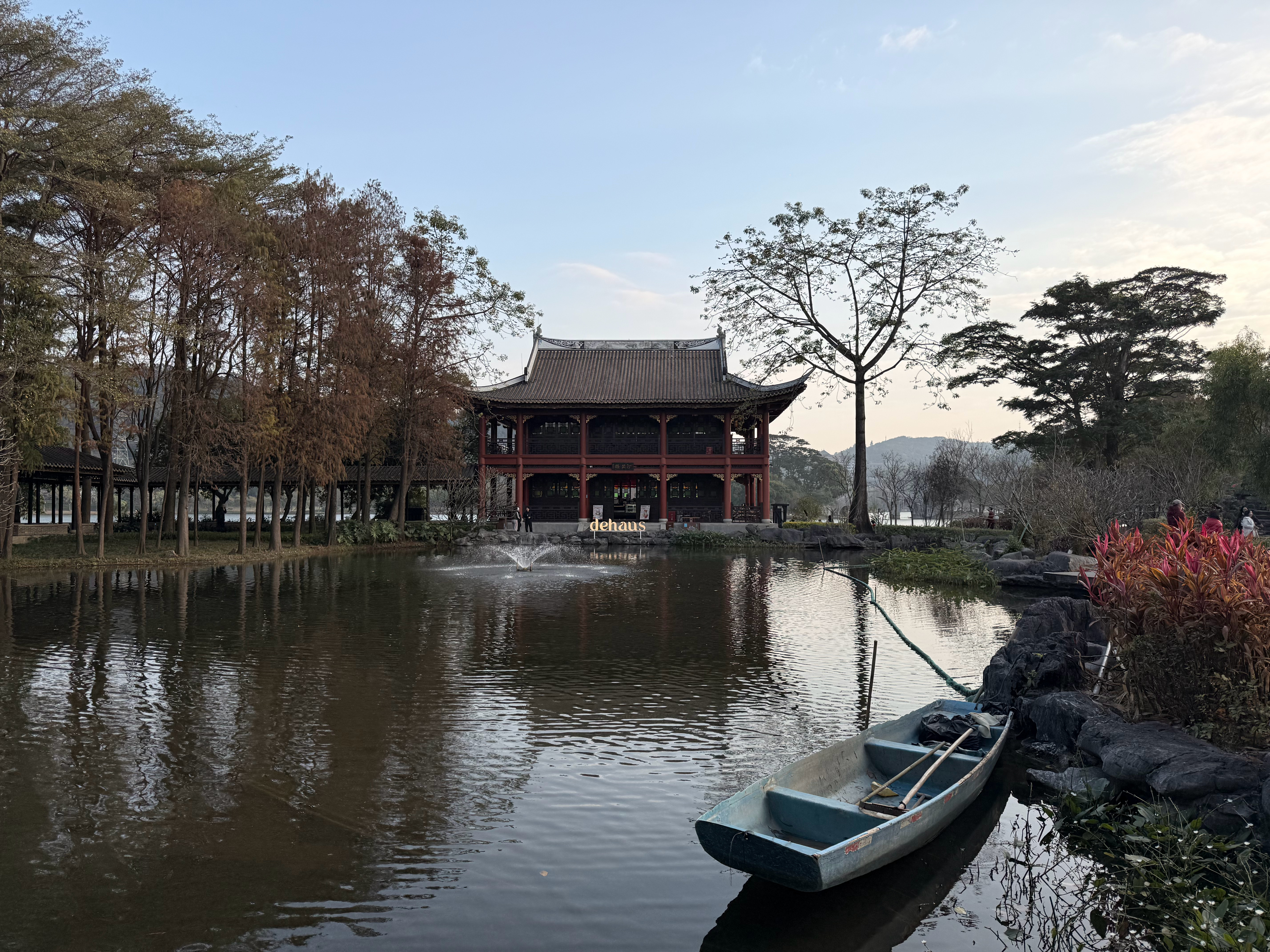 走入花园然后就能见到最里面湖边的位置有一栋两层的红色古楼环境是真的绝!特别是2楼的位置