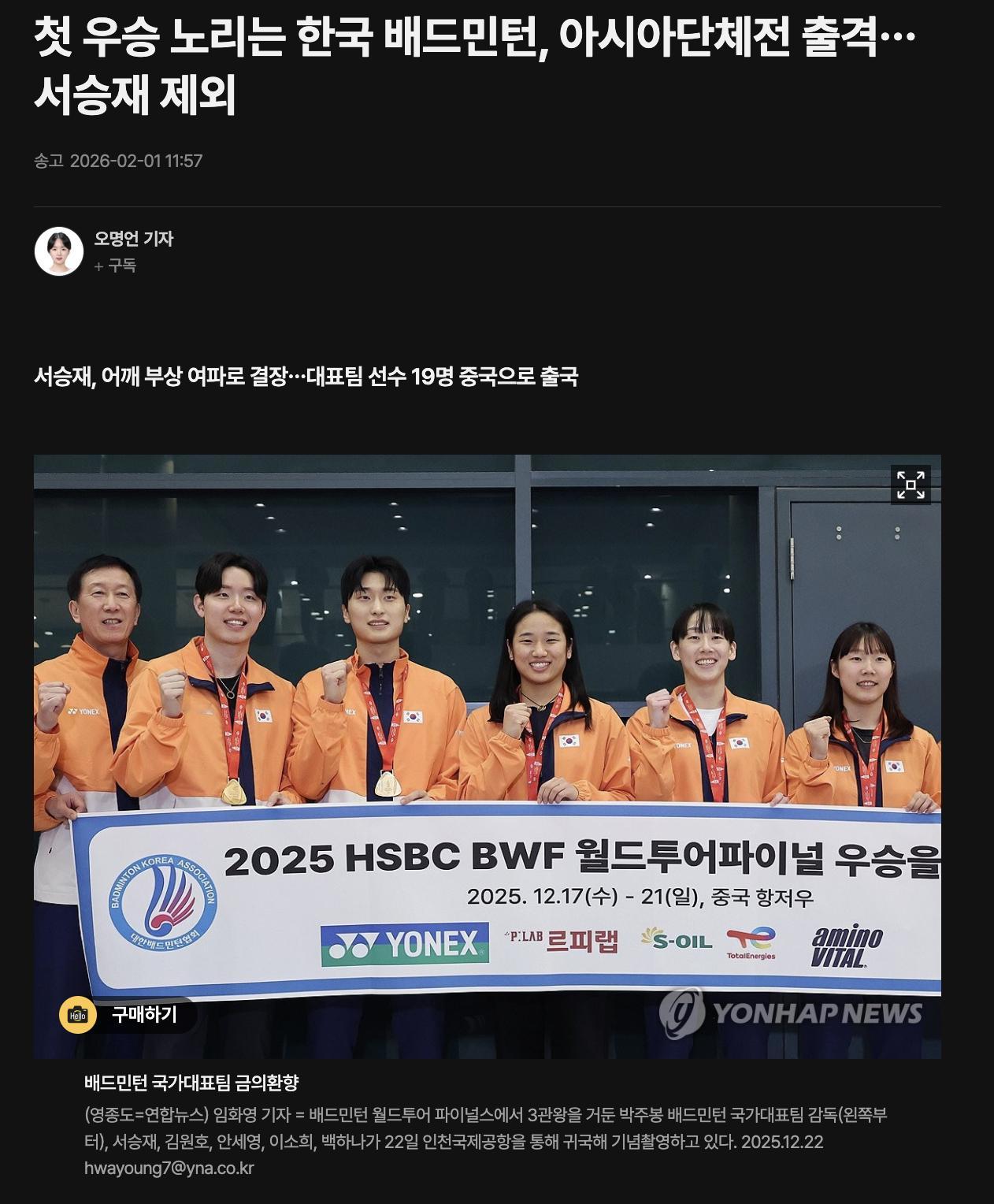 韩媒:徐承宰因肩伤退出2026亚洲羽毛球团体锦标赛
