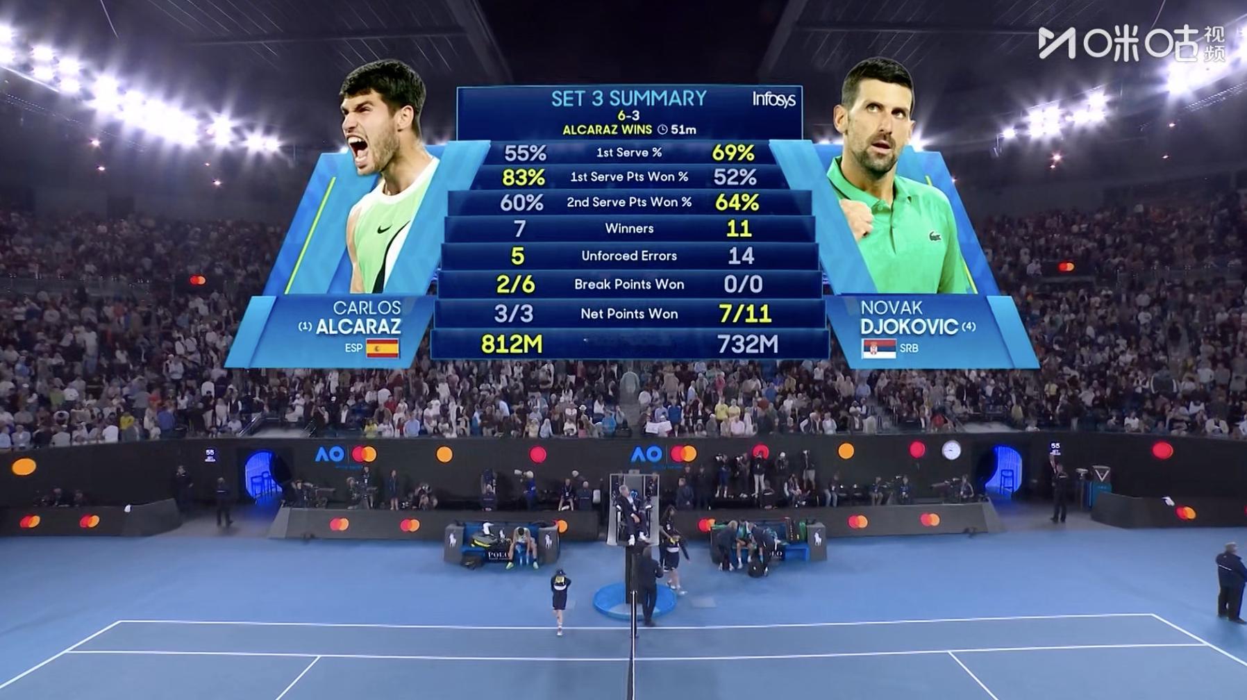 2026澳网男单决赛,阿尔卡拉斯6比3拿下第三盘,2比1暂时领先德约科维奇