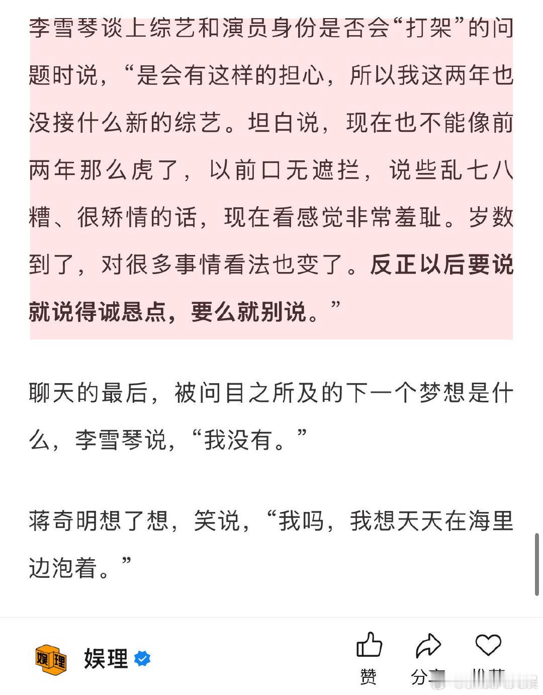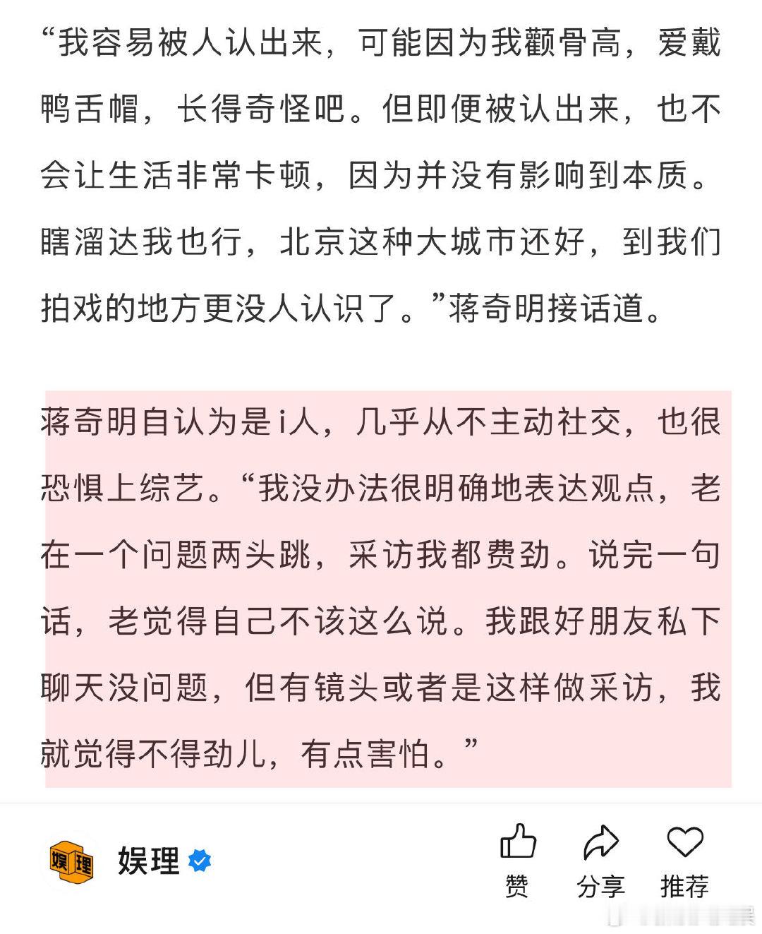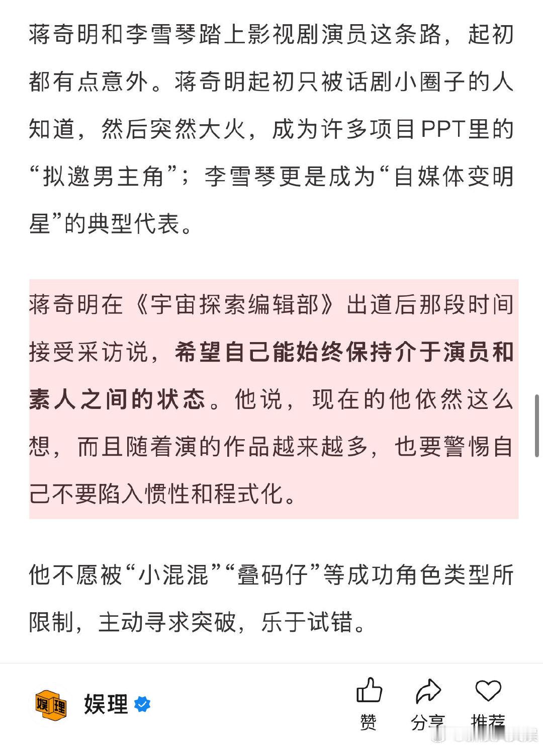 李雪琴谈接综艺和做演员的平衡蒋奇明说不想被小混混角色限制 曾在接受采访时说,希望自己能始终保持介于演员和素人之间的状态。现在的他依然这么想,而且随着演的作品越来越多,也要警惕自己不要陷入惯性和程式化。他不愿被“小混混”“叠码仔”等成功角色类型所限制,主动寻求突破,乐于试错。娱理独家↓