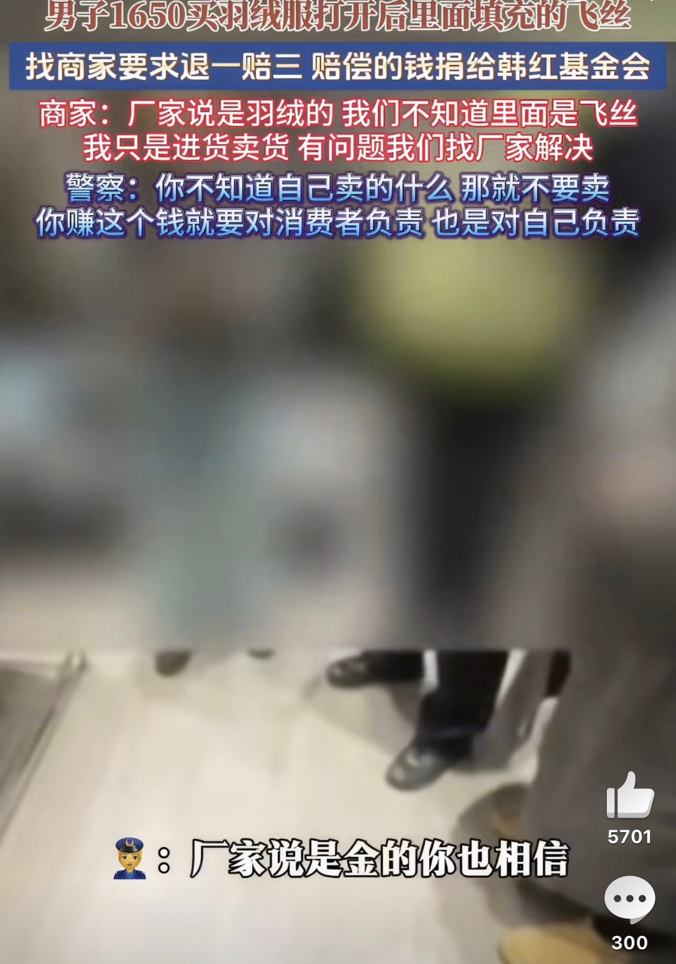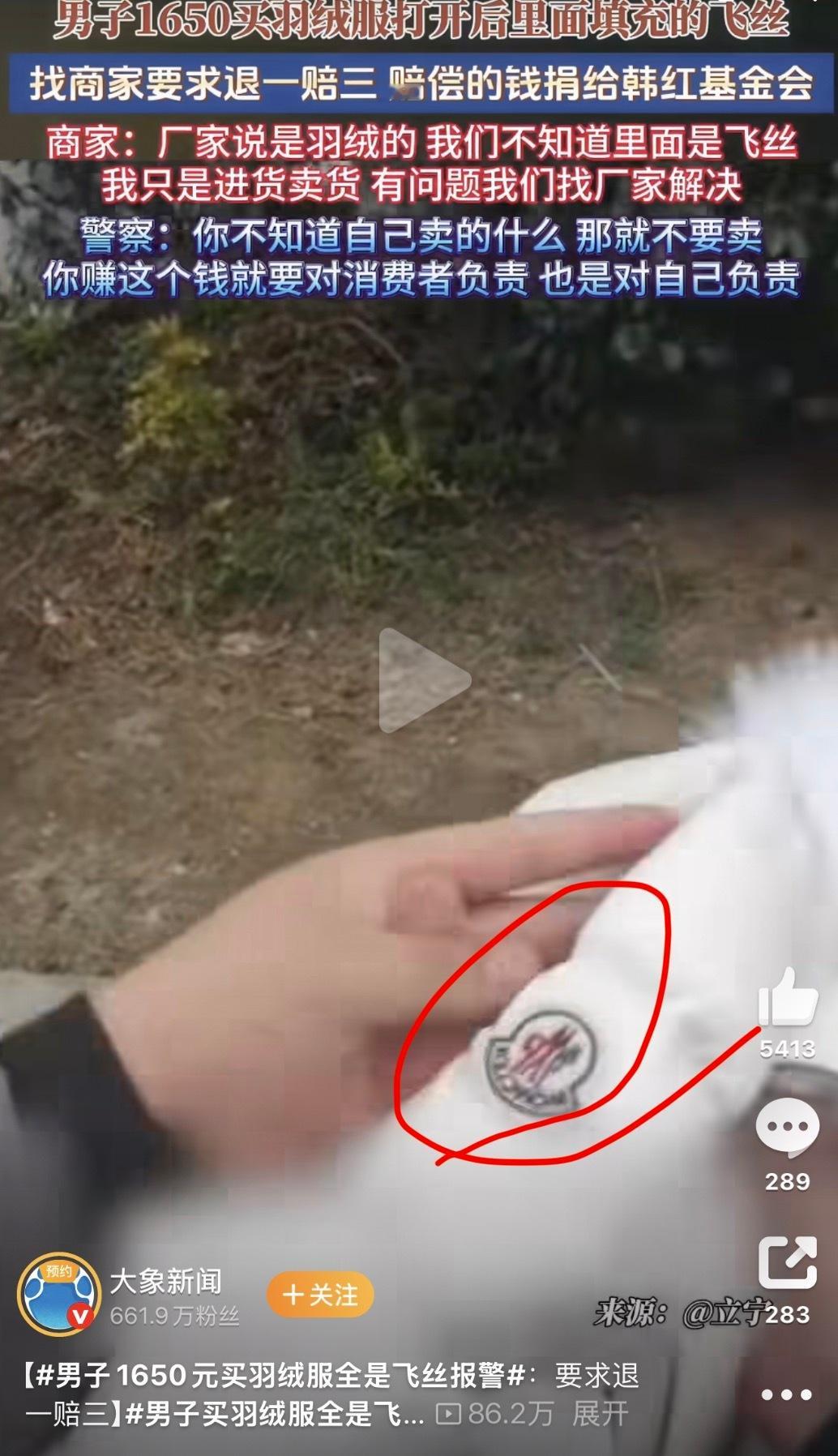 男子1650元买羽绒服全是飞丝报警这是1650的假蒙口吗?第二张图教育的太对了,最后店主以消费者的名义假一赔三把钱捐韩红基金会了。