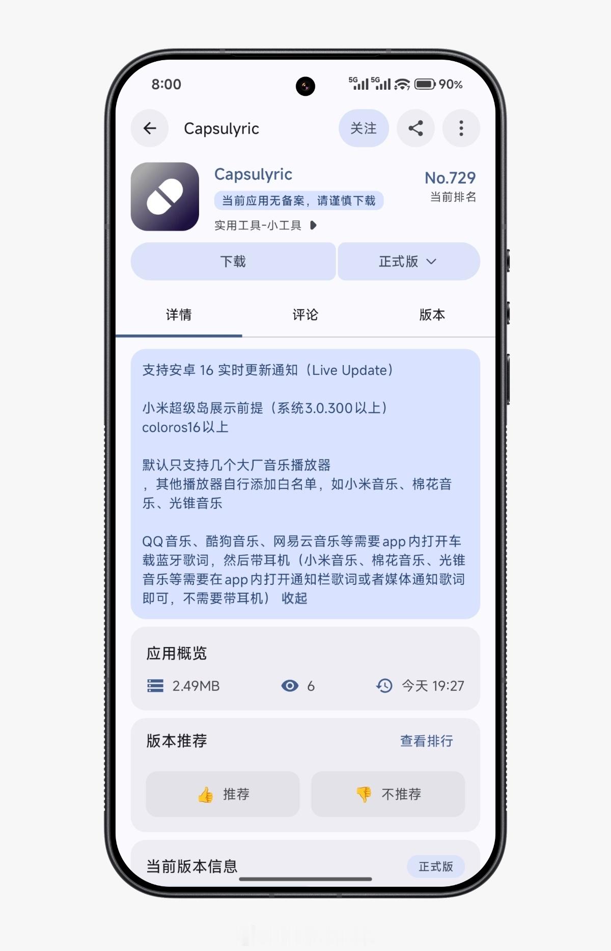 以上两点要求都没问题的话,下载好App开启好相应的权限(例如获取通知读取权限、无限制的省电策略),打开音乐播放👉打开Capsulyric👉取消音乐播放的小米超级岛,然后 ...好好享受状态栏歌词吧。