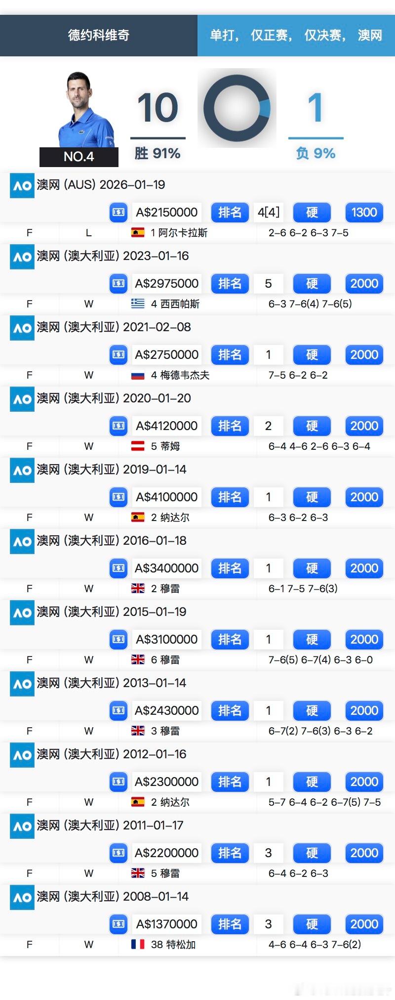 德约科维奇首夺澳网亚军 这个词条非常有意思看一眼都要恍惚一下首夺澳网亚军?没错,之前十次澳网男单决赛德约科维奇都是冠军!!!🏆🏆🏆🏆🏆🏆🏆🏆🏆🏆🥈