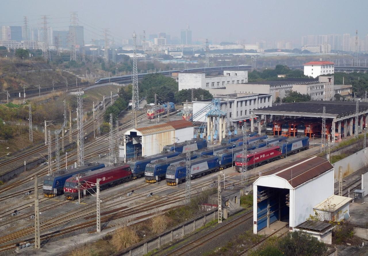 重庆机务段重庆北折返所和远处郑渝高铁经过的动车组列车。重庆北折返所投用也快二十年了,是在2006年底投用的,也就是渝怀铁路开通管内短途客运后不久,在重庆北站解挂的电力机车就入折返所进行整备,此外还有在重庆北站担当调车机车和小运转任务的内燃机车,随着在重庆北站到发的旅客列车的增加,这里整备的机车也在增加。