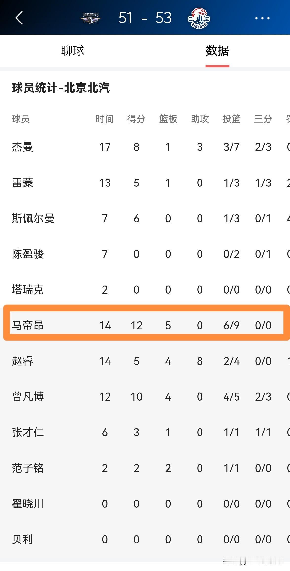 北京北汽外援马帝昂真是太争气了!在今天北京北汽主场迎战青岛崂山啤酒的比赛中,目前双方半场战罢,虽然北京北汽以51:53落后于对手,但是马帝昂的表现却非常的出彩。 在前两节比赛中,马帝昂替补出战14分钟,投篮9中6非常高效的砍下12分5篮板1抢断1盖帽,他的场上正负值为+6。 值得一提的是,在上半场比赛中,马帝昂和赵睿的内外线配合真是非常的精彩。