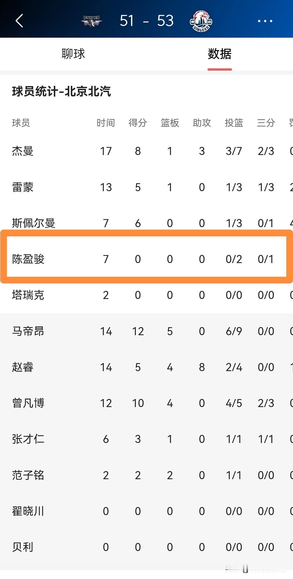 北京北汽球星陈盈骏真是毫无用处!在今天北京北汽主场迎战青岛崂山啤酒的比赛中,目前双方半场战罢,北京北汽以51:53落后对手2分。在前两节比赛中,陈盈骏的状态非常的低迷,他在首发出战的7分钟里,投篮2中0怒砍0分,还有1次失误和1次犯规,他的场上正负值为-14。 值得注意的是,陈盈骏由于状态太过糟糕,因此他仅仅出战了7分钟就惨遭许利民教练的弃用。