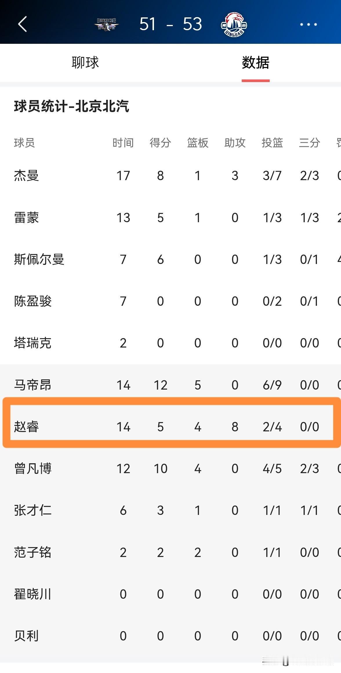 人家青岛那个小将半场三分球八中八,还好意思提赵睿!