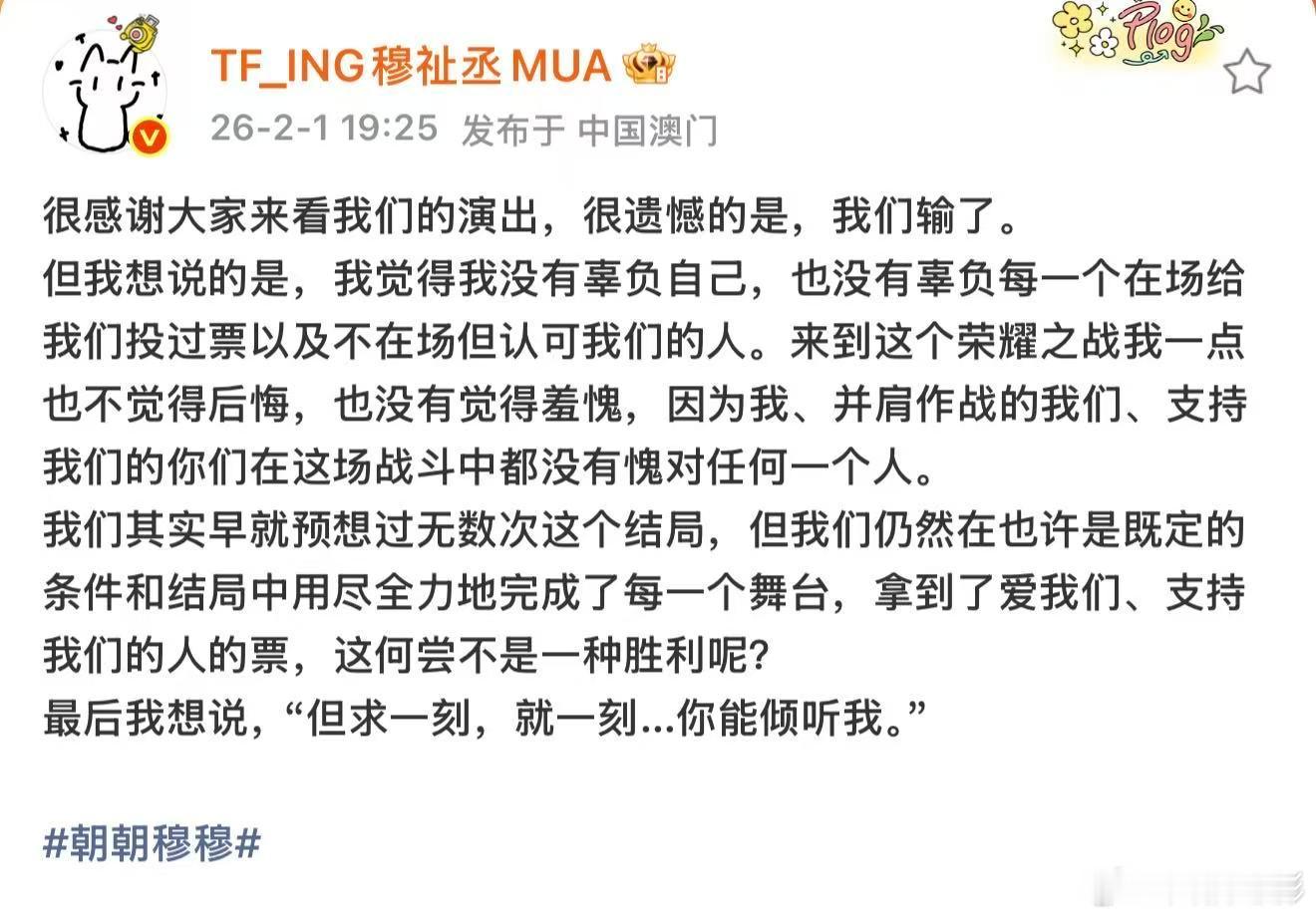 穆祉丞荣耀之战发文穆祉丞荣耀之战结束发文 2月1日,荣耀之战结束发文:很感谢大家来看我们的演出,很遗憾的是,我们输了。但我想说的是,我觉得我没有辜负自己,也没有辜负每一个在场给我们投过票以及不在场但认可我们的人。来到这个荣耀之战我一点也不觉得后悔,也没有觉得羞愧,因为我、并肩作战的我们、支持我们的你们在这场战斗中都没有愧对任何一个人。我们其实早就预想过无数次这个结局,但我们仍然在也许是既定的条件和结局中用尽全力地完成了每一个舞台,拿到了爱我们、支持我们的人的票,这何尝不是一种胜利呢?最后我想说,“但求一刻,就一刻…你能倾听我。”