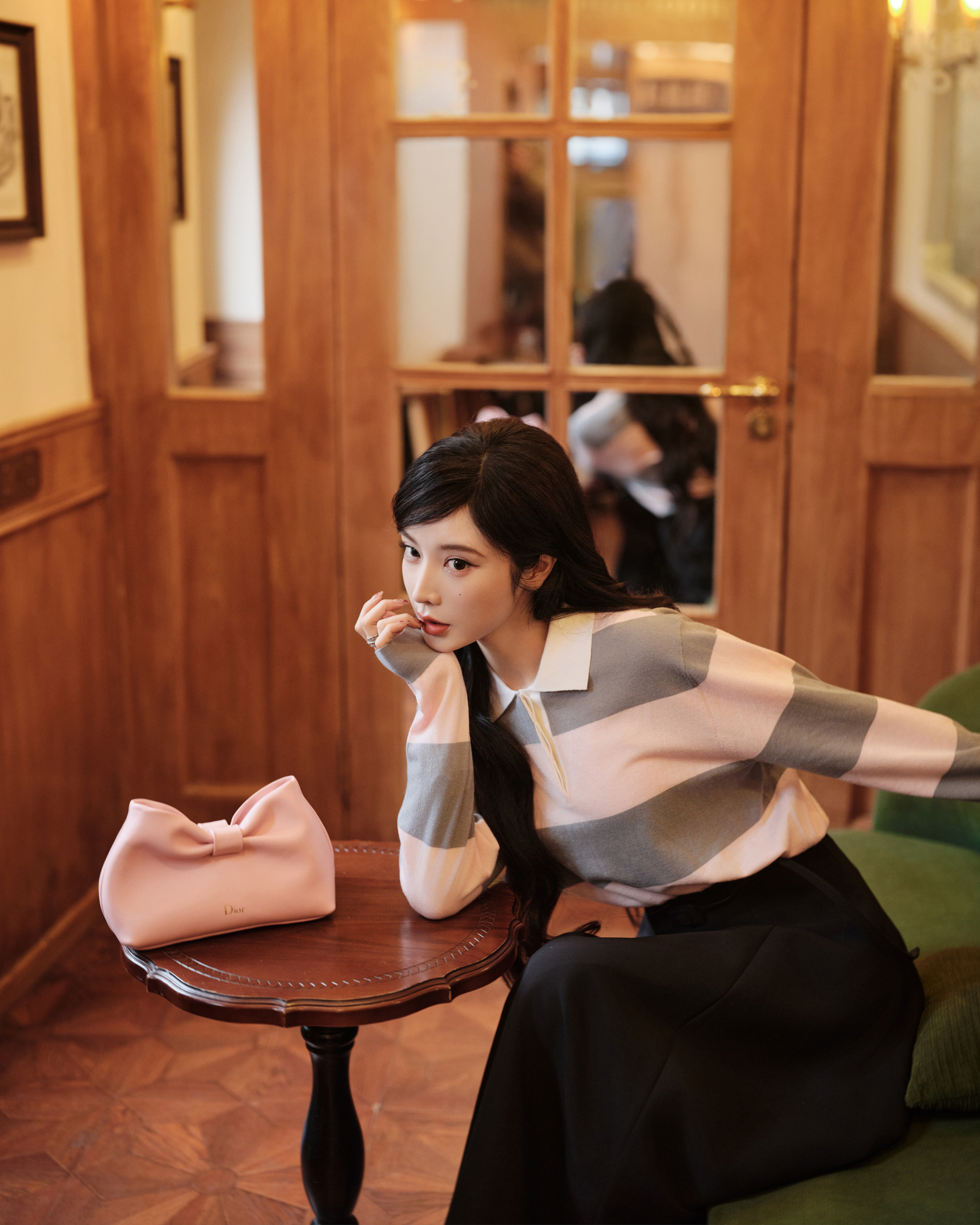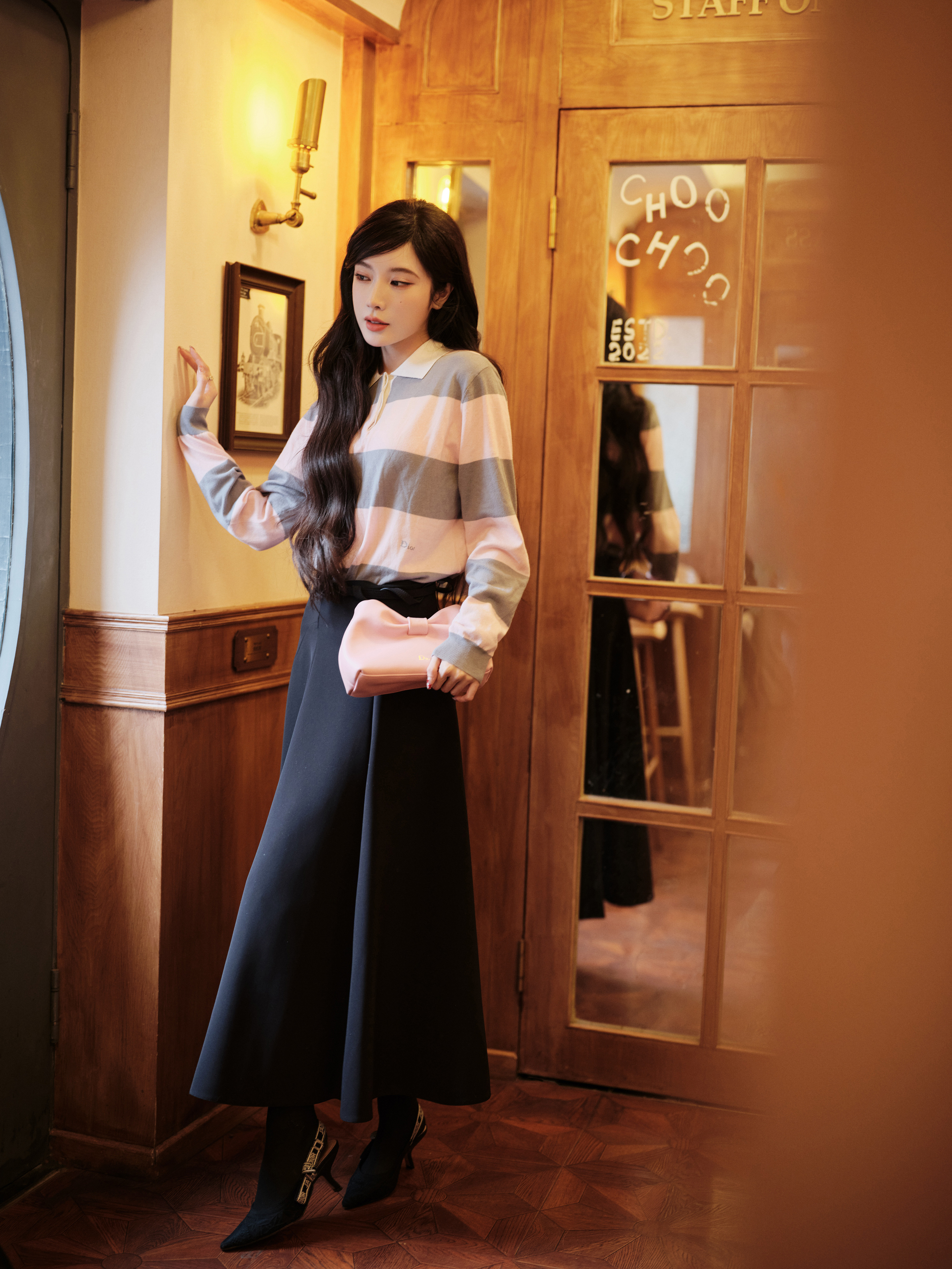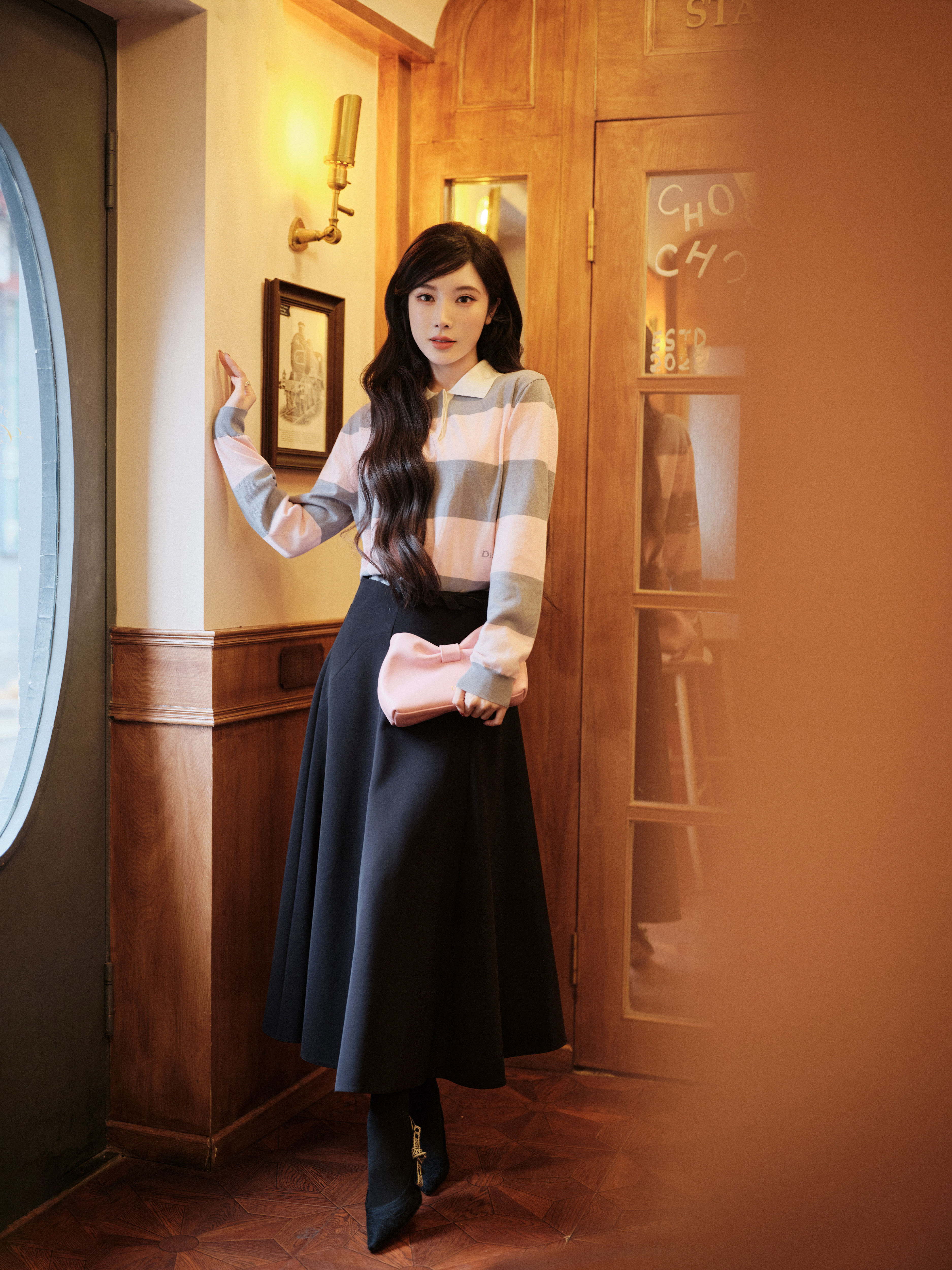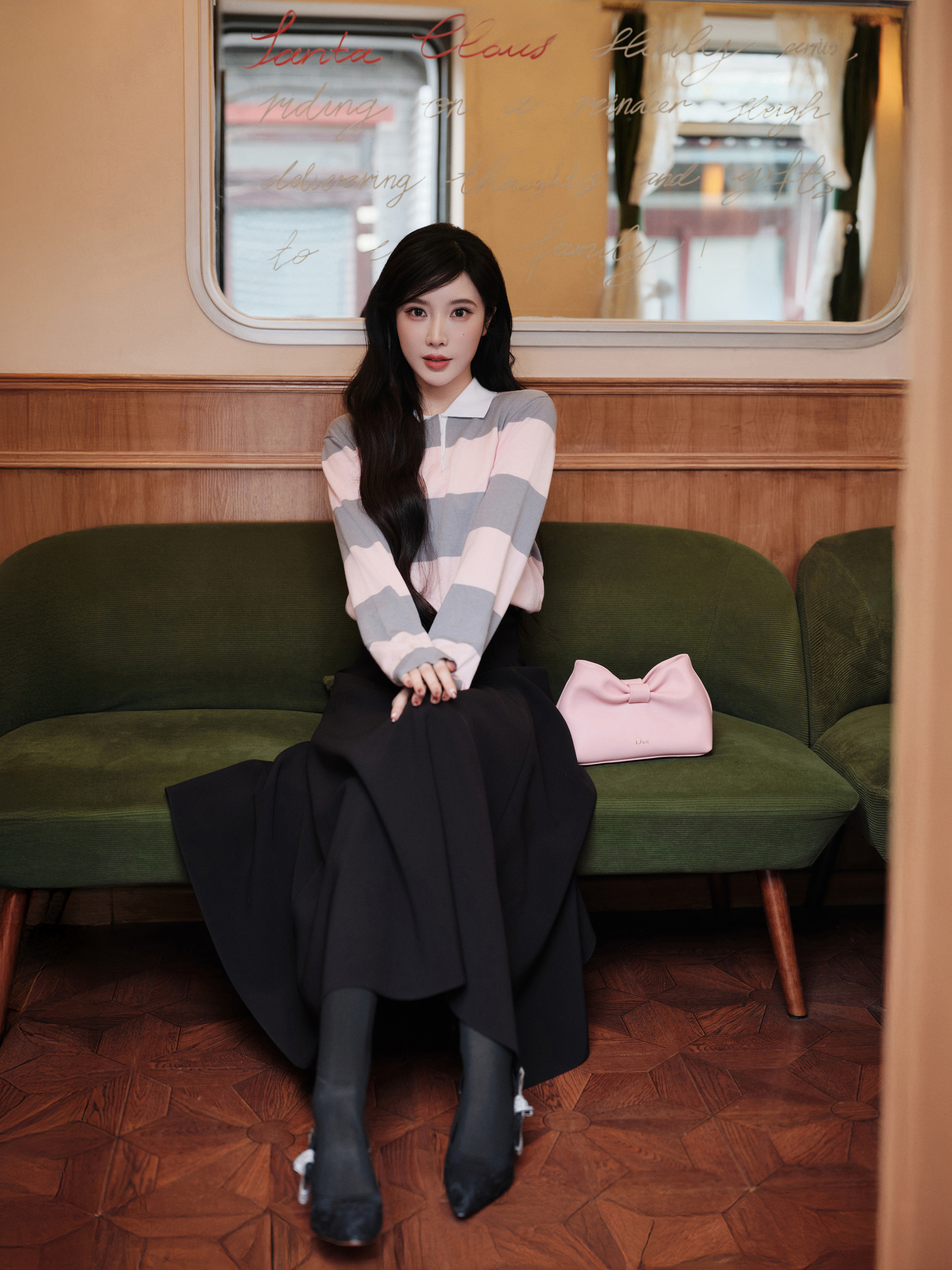 来自演员戴燕妮的一组造型新片 ,身穿 Dior by Jonathan Anderson 首季 2026 春夏成衣系列出镜 ,粉灰撞色条纹 Polo 衫搭配黑色伞裙 ,融合复古学院风与法式优雅感的全新搭配 ,很是眼前一亮哈 !点睛的 Dior Bow 系列手袋则以独特的蝴蝶结造型诠释迪奥标志性元素 ,柔雾粉色呼应色调 ,感受属于 Dior Girl 明媚又灵动的独特韵味 ~ 🎀