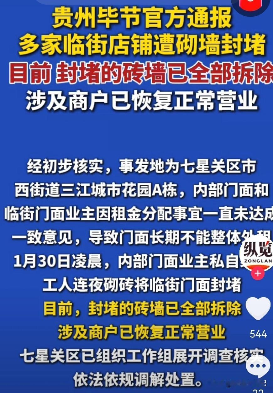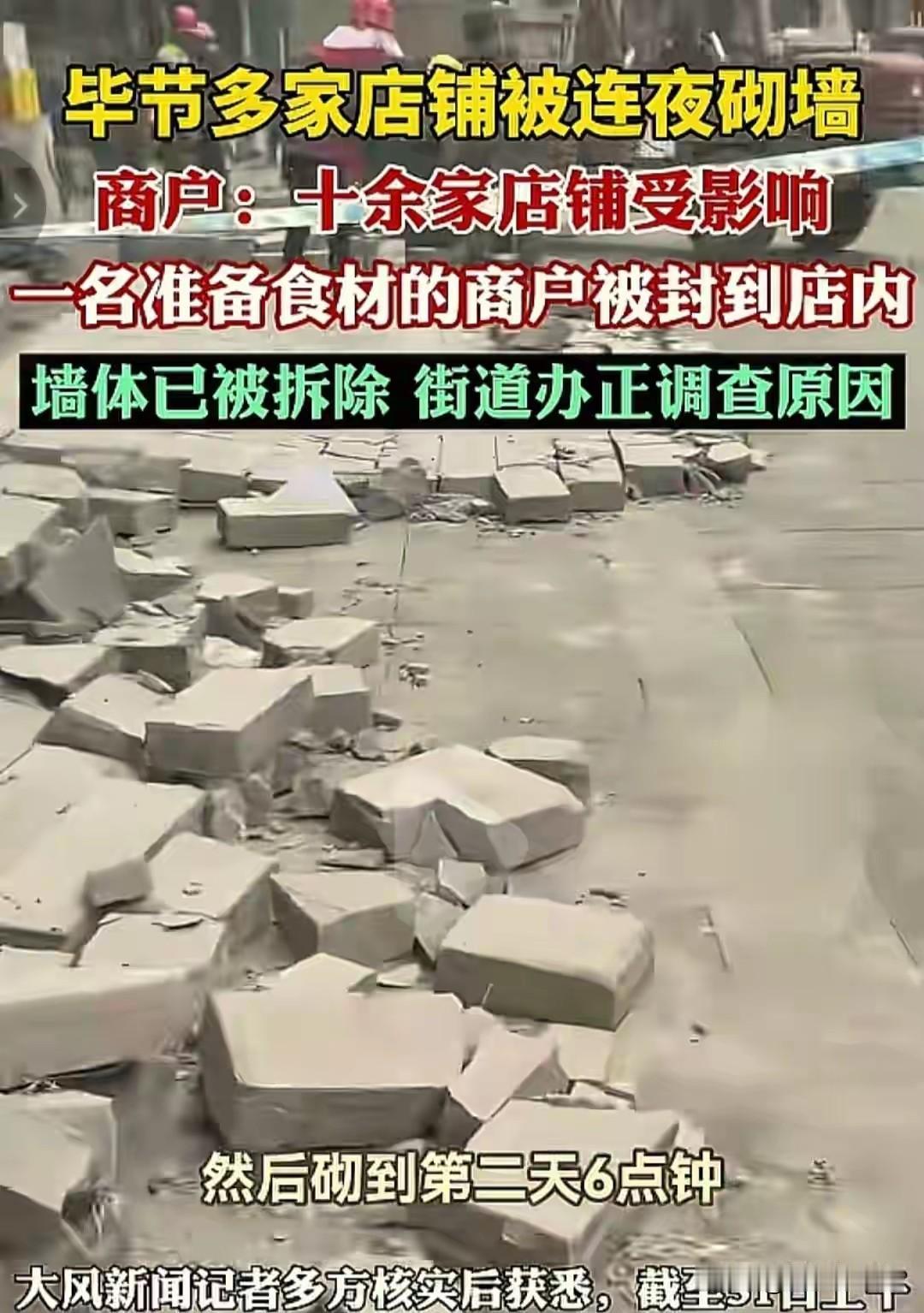 一觉醒来天塌了,店铺没了,就剩下新鲜出炉的筑墙,把自家商铺封的严严实实,更绝的是,店铺里还有人呢? 这是毕节七星关区某街道,1月30日的清晨发生的匪夷所思的事情,监控画面记录下了这场深夜的“突袭”:1月29日23时许,数名工人带着红砖与水泥悄然现身,分工明确地在临街商铺门前垒砌墙体,动作迅速且沉默,全程未通知任何商户或物业,更未出示任何合法施工手续。短短数小时内,原本敞开的商铺大门被彻底封死,仅墙顶露出半截招牌,在晨风中显得格外讽刺。 更令人心惊的是,一名经营包子铺的商户,为赶早市在凌晨五点便抵达店内准备食材,待他忙完手头活计想要出门时,却发现前门已被砖墙封堵,后路也无通道。 这场荒诞的封堵,让十余户商户瞬间陷入停摆。“我们按时交房租、缴物业费,勤勤恳恳做生意,怎么就突然遭了这样的横祸?”一名商户的质问,道出了所有人的愤懑与不解。 随着事件发酵,当地相关部门迅速介入才发现。原来是这条街,内部门面与临街门面的业主,因租金分配一事长期存在纠纷,导致门面无法整体外租,1月30日凌晨,内部门面业主私自组织工人连夜砌墙封堵临街门面 。 截至1月31日下午,封堵的砖墙才全部拆除,商户恢复正常营业,工作组正依法依规调解处置。可是深夜砌墙封店的行为,早已超出了民事纠纷的范畴。法律专家指出,未经合法授权封堵他人商铺,涉嫌侵犯商户的财产权与经营权;而将人困于封闭空间内,更可能触及限制人身自由的相关法律,甚至构成刑事犯罪。