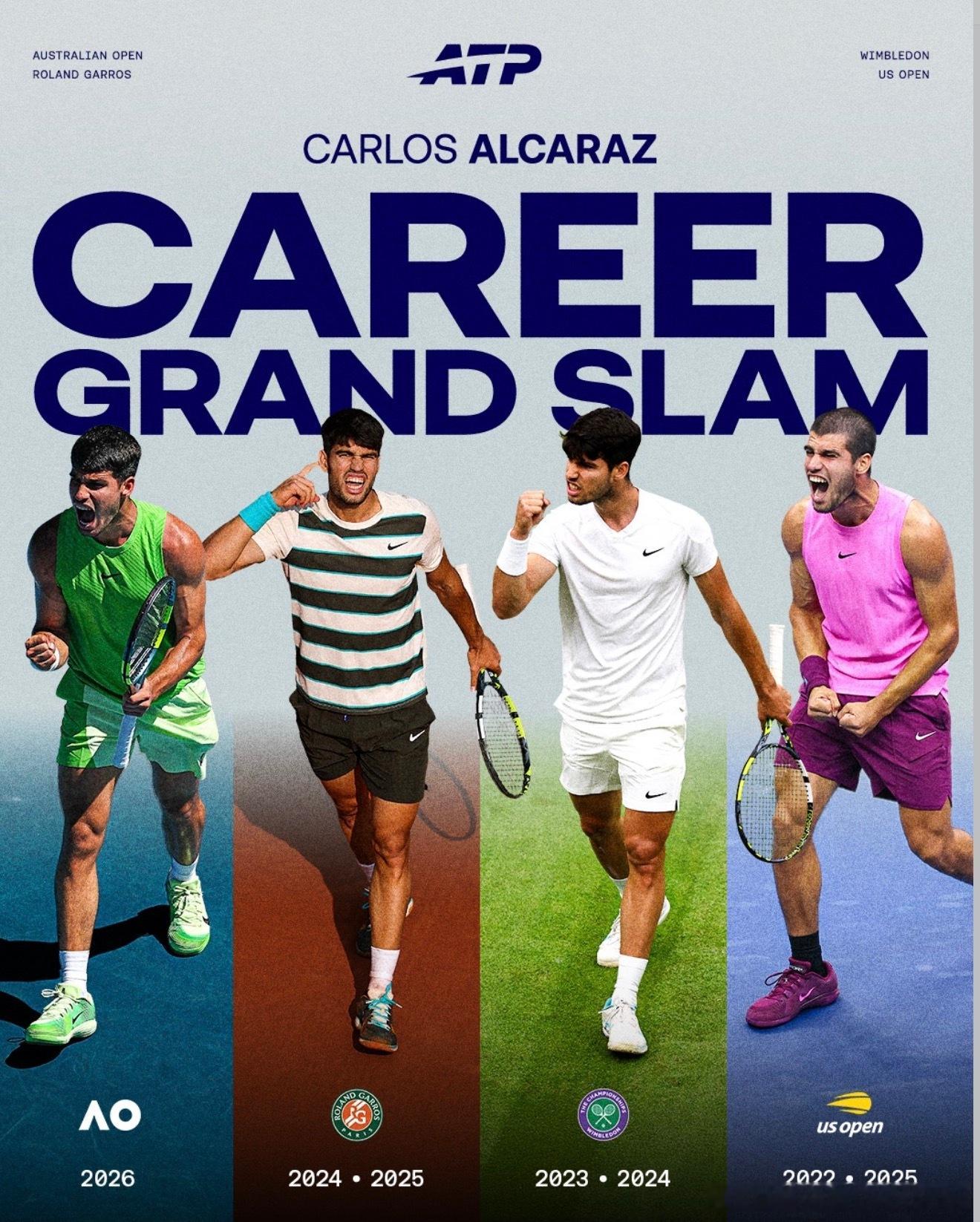 阿尔卡拉斯!史上最年轻的全满贯得主!22岁272天!!!已经有7个大满贯冠军!!!澳网:2026🏆法网:2024🏆2025🏆温网:2023🏆2024🏆美网:2022🏆2025🏆阿尔卡拉斯实现全满贯阿尔卡拉斯大满贯第7冠