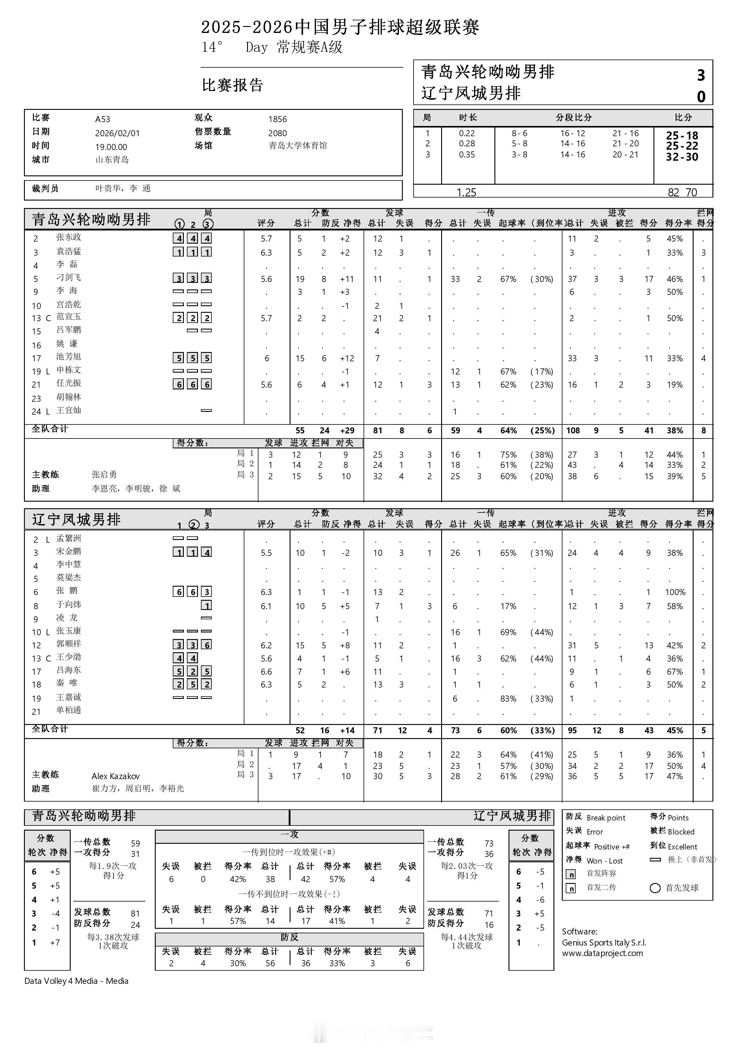 【中国男排超级联赛 青岛3-0辽宁】2月1日晚上,A级常规赛第14轮,青岛兴轮呦呦在主场以3-0(25-18, 25-20, 32-30)完胜辽宁凤城。刁剑飞19分,池芳旭15分(拦4);郭顺祥15分,宋金鹏、于向炜各10分,吕海东7分。