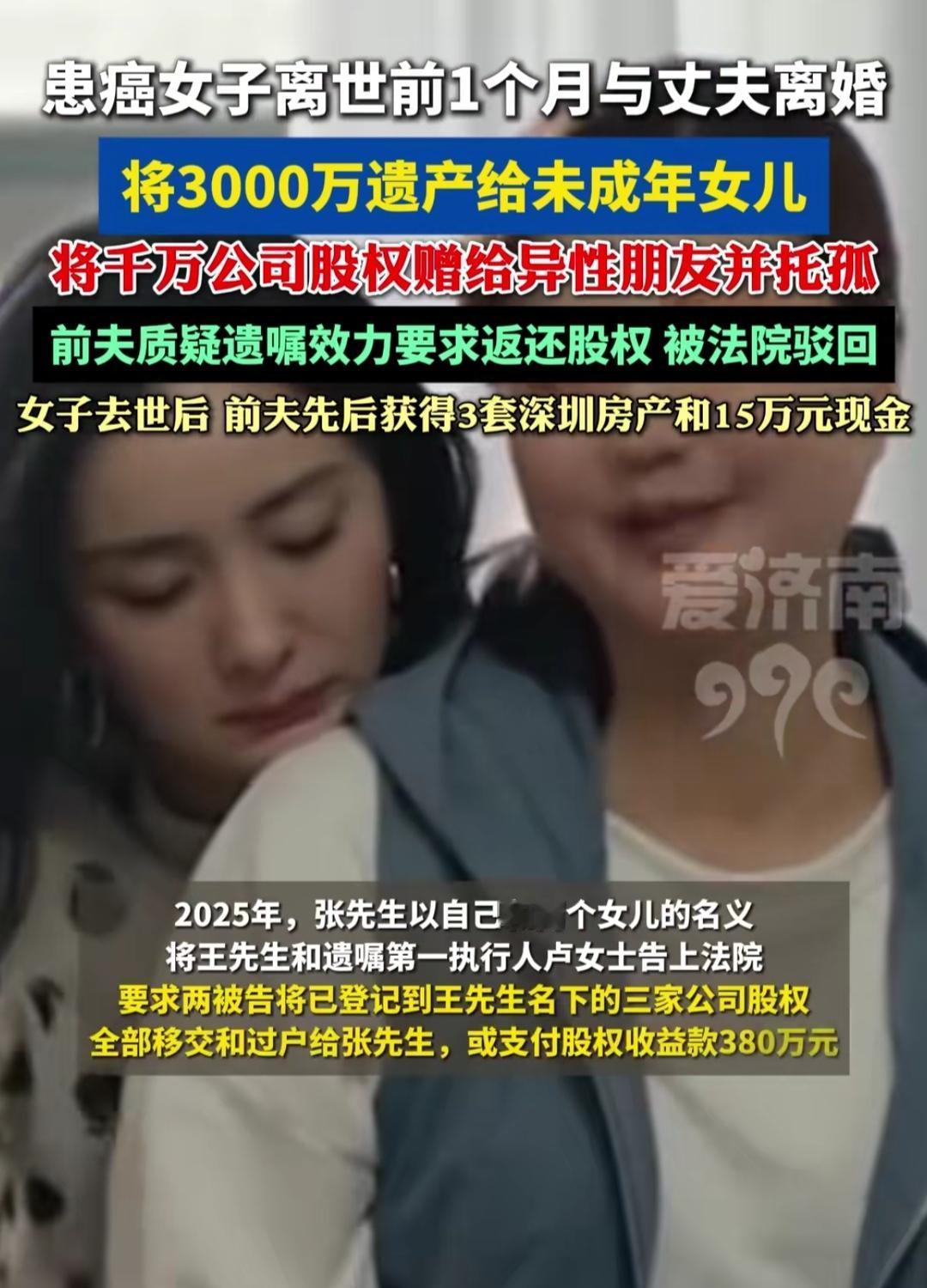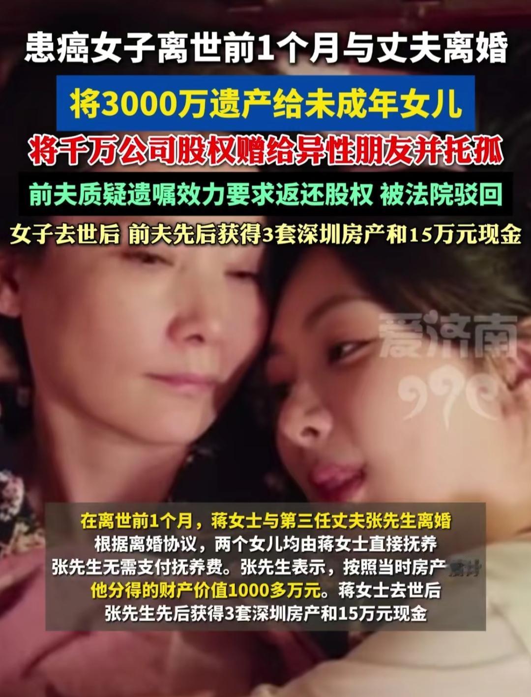 刷到蒋女士的新闻,盯着“离婚时前夫已分走千万”愣了神——她是在癌症病房签的协议,给前夫留了3套深圳房、1套惠州房,连230万现金都算清,转头就把3000万锁进女儿的“成年保险箱”,22岁才能动。 她把公司股权塞给合作15年的朋友,只说“帮我看着俩孩子”。有人说她薄情,可遗嘱里写着:“信老王15年没坑过我,钱锁着是怕人盯孩子的钱。”亲妈没提、弟弟只拿150万房,是怕软心肠护不住娃。 后来前夫拿着千万家产争股权,法院驳回时我松了气——她算的不是账,是把“别欺负我娃”的念头,刻进每一份遗嘱里。离开前的离婚、锁钱、托孤,都是给孩子焊的“安全门”。 这哪是算计?是癌症磨不掉的母性:她把“活下去”的底气,钉在孩子手里。连离开都在兜底的母爱,哪是软绵绵的抱,是咬着牙铺的路。
