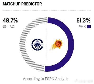 ESPN这次预测快船胜率48.7%!而太阳有51.3%双方基本55开!本赛季前三次交手,太阳赢了两场!太阳也算快船半个苦主了!