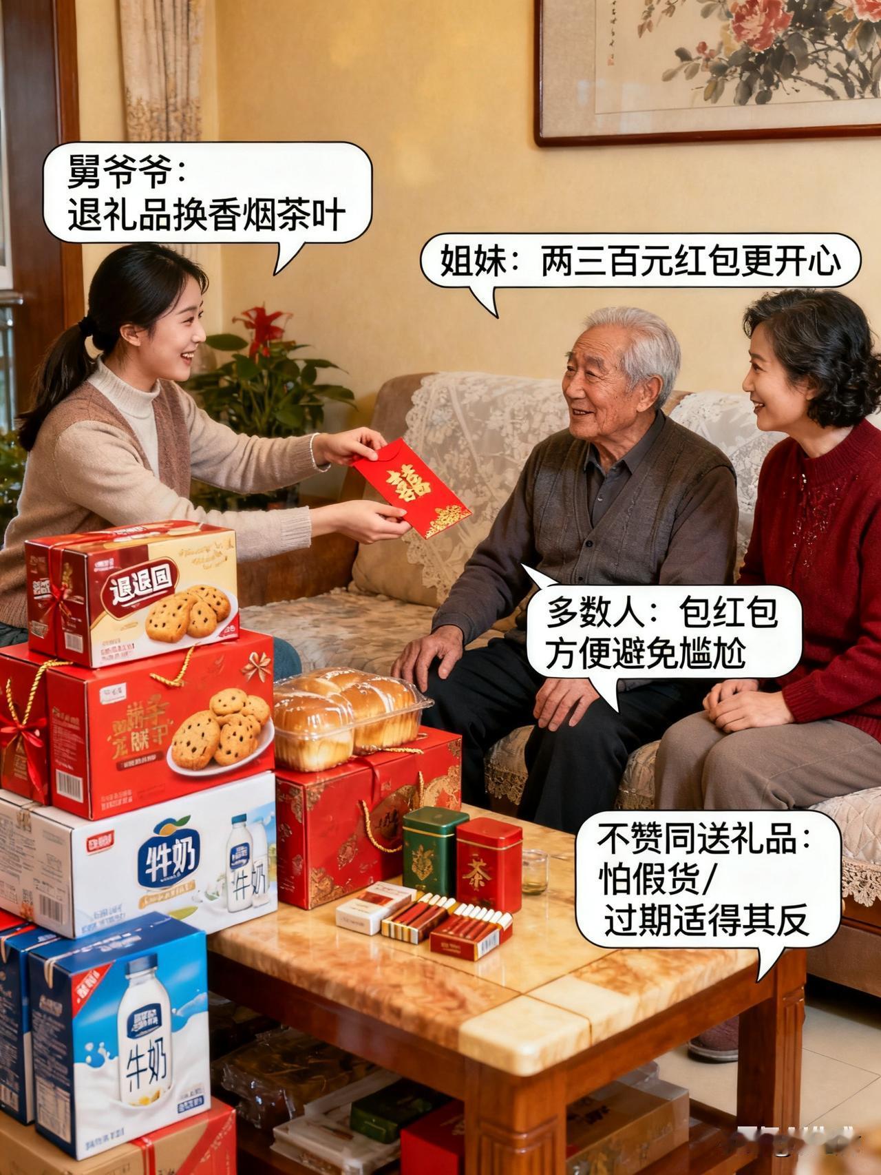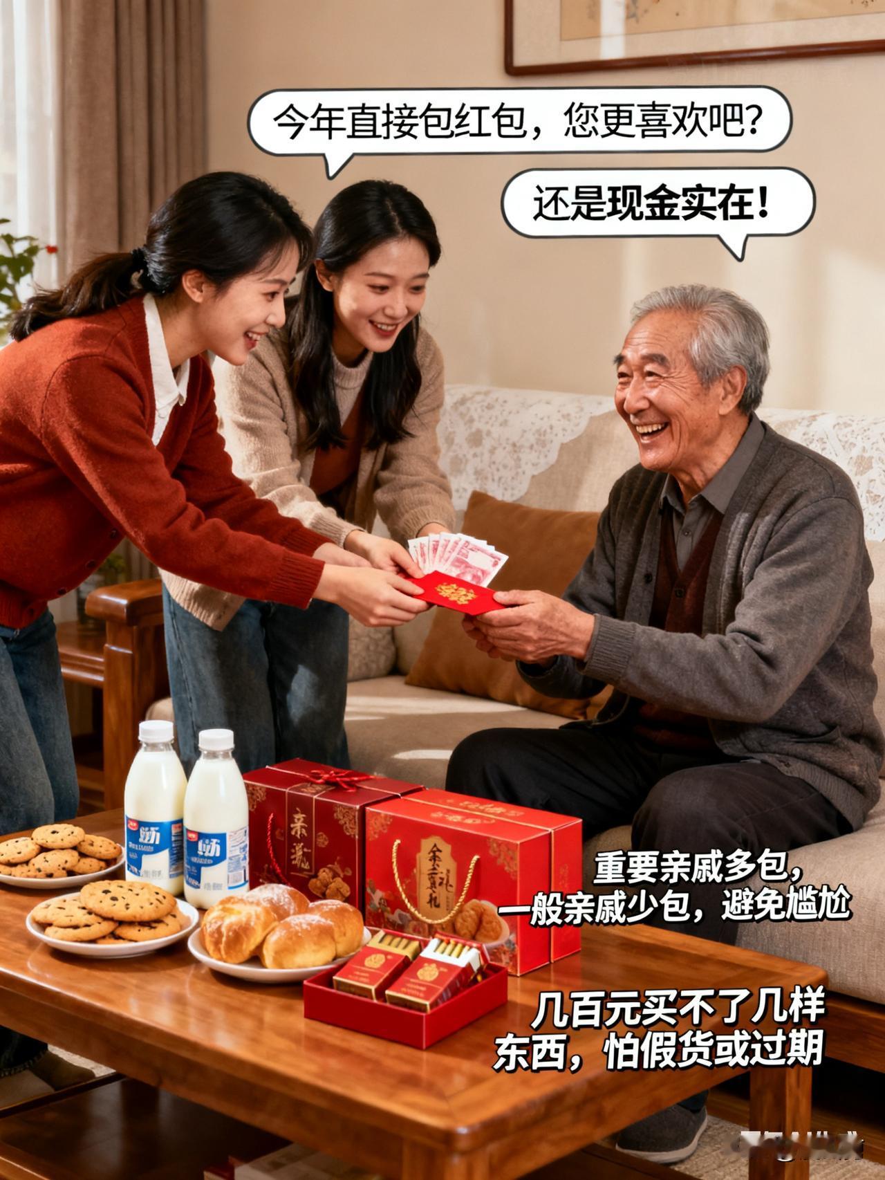 去亲戚家拜年,个人觉得还是裹个红包给现金好。 就拿我舅爷爷来说,往年我姐妹拜年看望他时,都喜欢买几样礼品带给他,像牛奶、饼干、面包、香烟之类的。其实,这4样礼品中,我舅爷爷只喜欢香烟,最后牛奶、饼干、面包之类的都让他到店家三文不值二文的给退换了自己喜欢的香烟和茶叶。 后来,我和姐妹打了招呼后,她们逢年过节就不再买礼物了,而是给两三百元的红包,这反而让舅爷爷开心。 其实,很多人都觉得逢年过节包个红包最实在。重要的亲戚多包点,一般亲戚就少包点。说个小气话,包多包少随自己意,反正当时看不到,免得给少了显得尴尬。 我不赞同拜年送礼品,是觉得如今的几百元钱,根本买不了几样东西。有时候稍不留意买个假货或过期的东西送给人家,反而适得其反。 所以说,我觉得拜年还是裹个红包方便又实在! 友友们,你们是怎么看的呢?评论区聊聊! 图片由Al生成