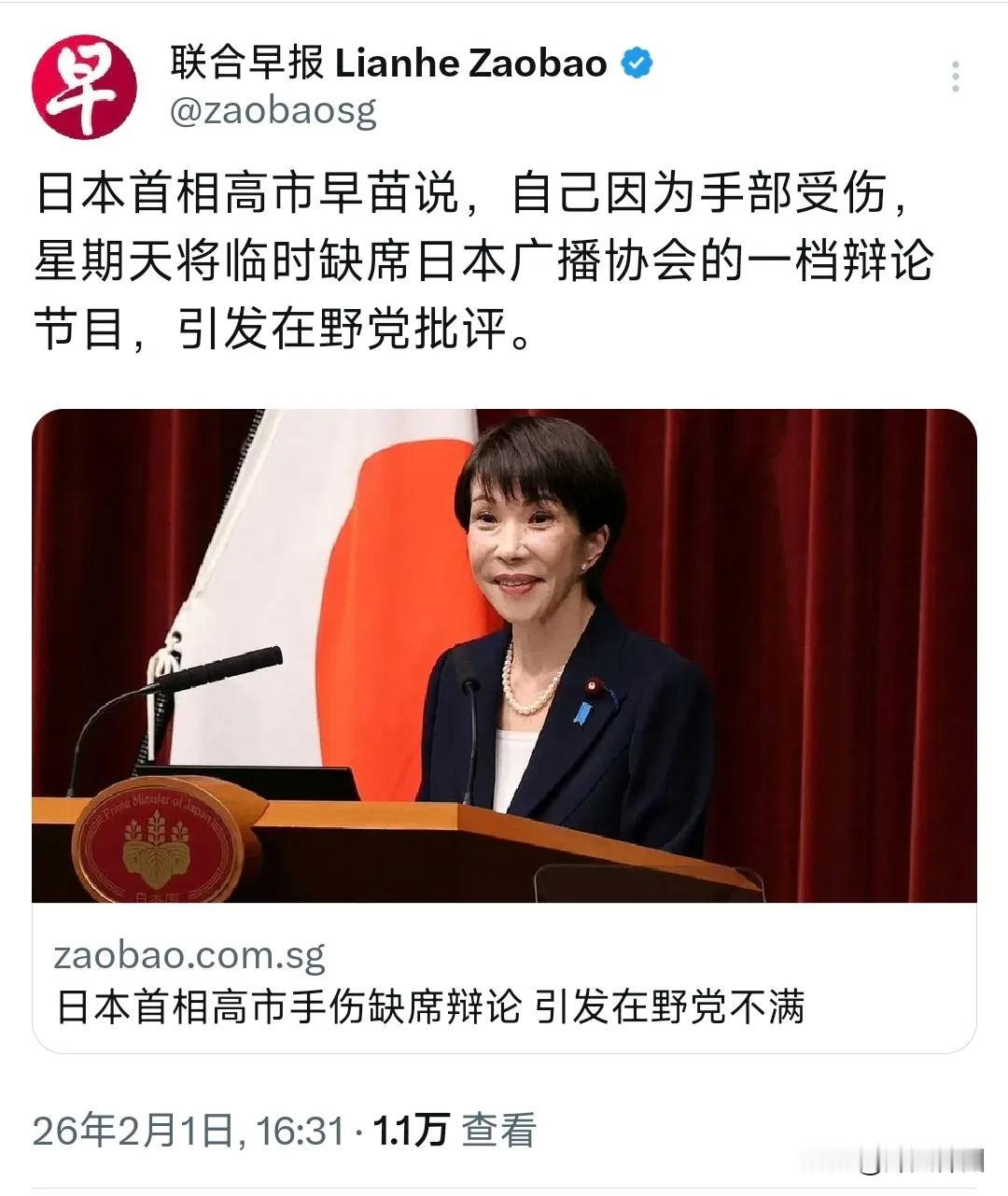外媒今天(2月1日)报道:“日本首相高市早苗说,自己因为手部受伤,星期天将临时缺席日本广播协会的一档辩论节目,引发在野党批评。” 评几句: 高市早苗以手伤缺席选前辩论,背后藏着日本选战的深层考量!选前关键阶段的重磅辩论,她突然以手部受伤为由缺席,当即引发在野党集中批评,争议声迅速传开! 此前她还正常推进助选行程、参与外事互动,全程状态平稳,如今恰逢关键辩论却突发伤情缺席,这样的时间节点,难免让外界多有猜测。要知道,这场辩论本是在野党针对相关争议向她质询的重要场合,她的缺席,恰好避开了正面回应质疑的机会,这也是在野党提出批评的核心原因。 选战本是候选人直面民意、回应诉求的关键场合,她此时选择缺席辩论,不仅容易引发选民对履职态度的讨论,也让外界对自民党当下的选情多了一层关注,在野党直言此举难获民众信任,也戳中了不少舆论关注点! 更值得细品的是,她此前曾明确表态选情相关承诺,如今在关键辩论前临时缺席,本质是担心相关争议发酵影响选情,更是怕当面质询中难以回应相关疑问,反而让局势被动! 政客伤病本是寻常事,但选前关键节点的临时缺席,极易被解读为避战,这正是外界争议的焦点。高市早苗伤的是手,避的是当面回应的场合,难免让民众对其履职诚意多了几分疑虑! 说到底,选票认的是诚意不是临时的托词,回避质疑难平息争议,2月8日的投票,终将给出最真实的民意答案!