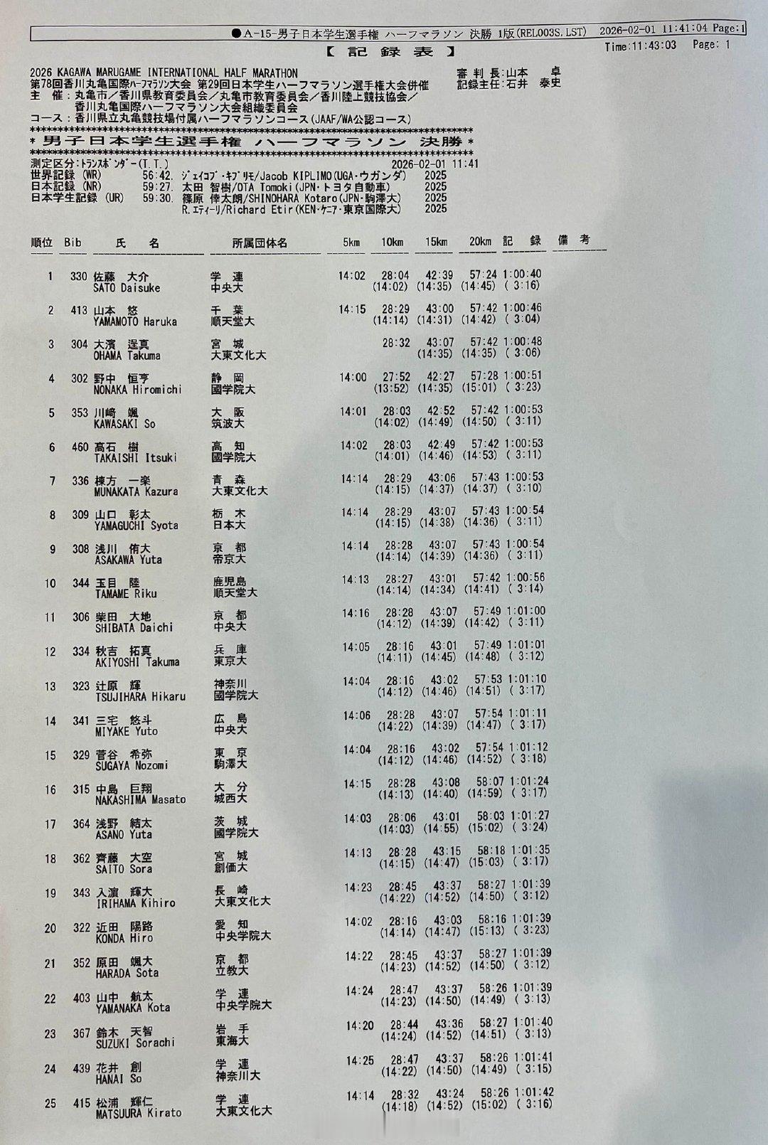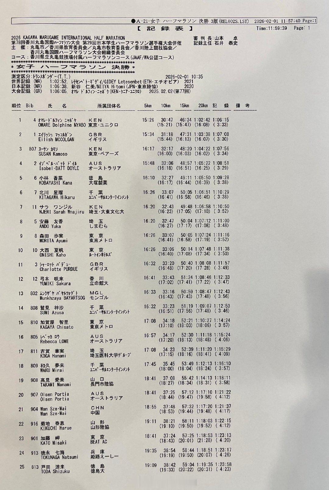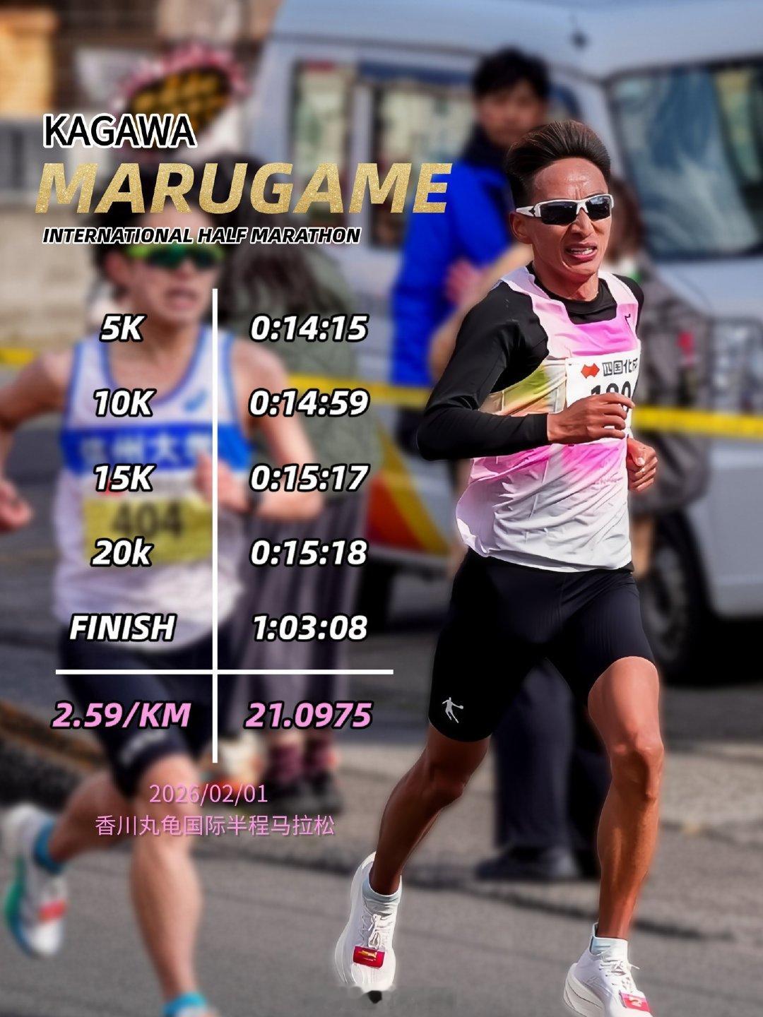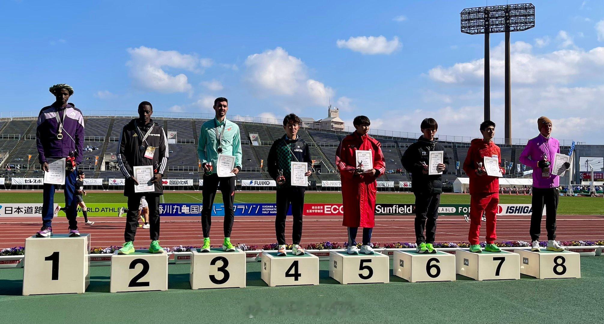 2026日本第78回香川丸龟国际半程马拉松:——男子1、肯尼亚 Richard Etir 59:07 CR2、肯尼亚 Emmanuel Maru 1:00:063、乌拉圭 Santiago Catrofe 1:00:21 NR7、日本 佐藤大介 1:00:408、挪威 Sondre Moen 1:00:469、日本 山本悠 1:00:4610、日本 大滨逞真1:00:48中国 贾俄仁加 1:03:08——女子Pos Athlete Country/Team Time1、肯尼亚 Dolphine Omare 1:06:152、英国 Eilish McColgan 麦考根 1:07:083、肯尼亚 Susan Kamotho 1:07:564、澳大利亚 Isobel Batt-Doyle1:08:515、日本 小林香菜 1:09:286、日本 北川星瑠 1:10:298、日本 安藤友香 1:11:0011、英国 Charlotte Purdue 普度 1:11:57