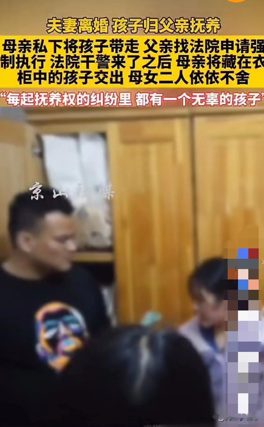 离婚了的家庭,孩子到底是跟着爸爸好,还是妈妈好?本来不想讨论这个问题,可是近日刷到一离婚的家庭,因为孩子的事情,还请了法警。 也许真的有迫不得已的苦衷,两个人终究还是走到了离婚的地步,根据法院的判决,孩子归咎到了有更多抚养能力的父亲一方,可是对于母亲一手养大的孩子来说,又有多残酷呢? 这位不愿意屈服的母亲,竟然偷偷藏起了孩子,直到男方申请了法院的强制执行,在法警的劝导下,母亲才依依不舍的,把藏在衣柜里的孩子交了出来。母亲的失落,不舍,不甘全在她的泪水里。 “都说每起抚养权的纠纷里,都有一个无辜的孩子”。也许这个问题从来没有标准答案,却被无数破碎的家庭反复拷问。法院的判决往往基于“最优抚养原则”,经济实力、居住条件、稳定收入等客观指标成为重要依据,但法律的冰冷条文,终究难以丈量情感的厚度。 母亲的执念,或许在法律层面显得“任性”,却藏着最朴素的母爱本能。当这份联结被强行切断,孩子感受到的不仅是分离的痛苦,更可能是被抛弃的迷茫。 抚养权的争夺不该是一场零和博弈,而应是一场以孩子为中心的守护行动。愿每一对离婚的父母,都能放下执念与对抗,让孩子在破碎的家庭结构中,依然能感受到完整的爱。更愿每一个无辜的孩子,都不必在父母的争执中惶恐不安,都能在温暖的守护中,健康快乐地长大。