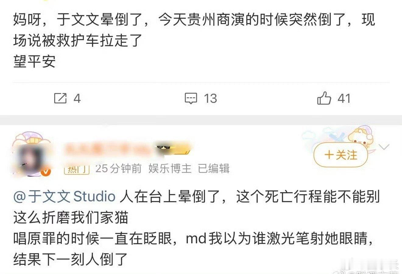 于文文演唱会晕倒这是强度太大,低血糖犯了嘛!演唱会期间竟然晕了,听前线粉丝说还被救护车拉走了,要照顾好自己呀