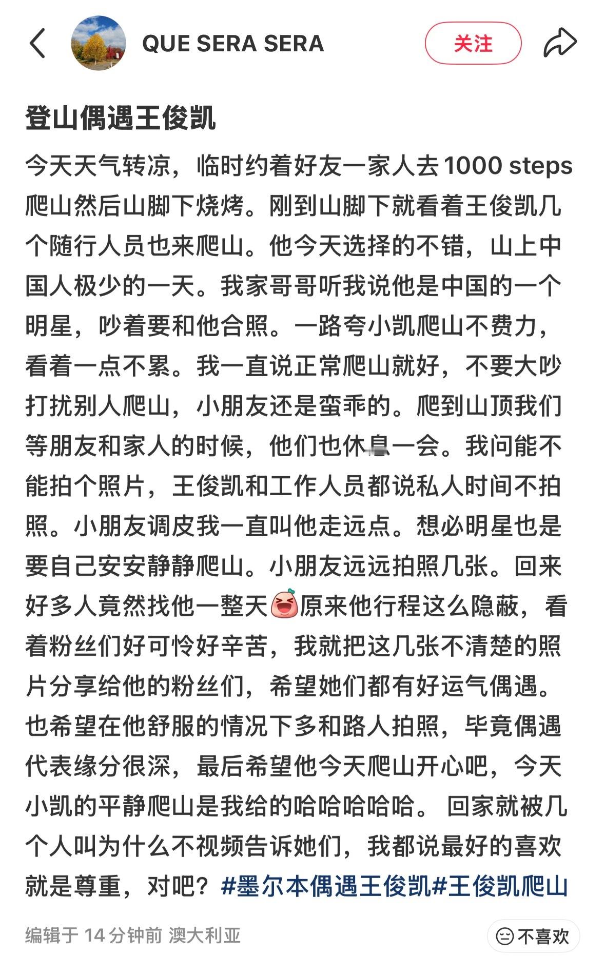网友在墨尔本偶遇了王俊凯爬山!小凯还被夸“爬山不费力,看着一点不累”哈哈哈哈哈,就是体能好!