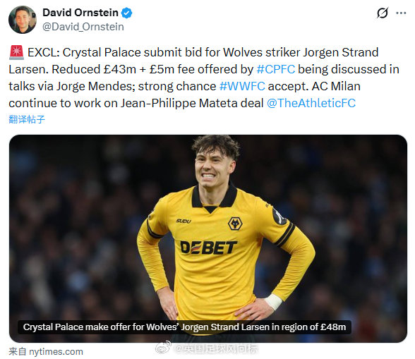 【水晶宫4800万求购拉尔森】TA名记DO独家消息:水晶宫已经向狼队开出正式报价,4300万英镑(固定)+500万英镑(浮动条款),求购25岁挪威国脚中锋拉尔森,球员的经纪人门德斯正在操作转会谈判,狼队确定接受这份报价。另一方面,水晶宫中锋马特塔,AC米兰继续全力推动引进这名法国中锋的转会交易。