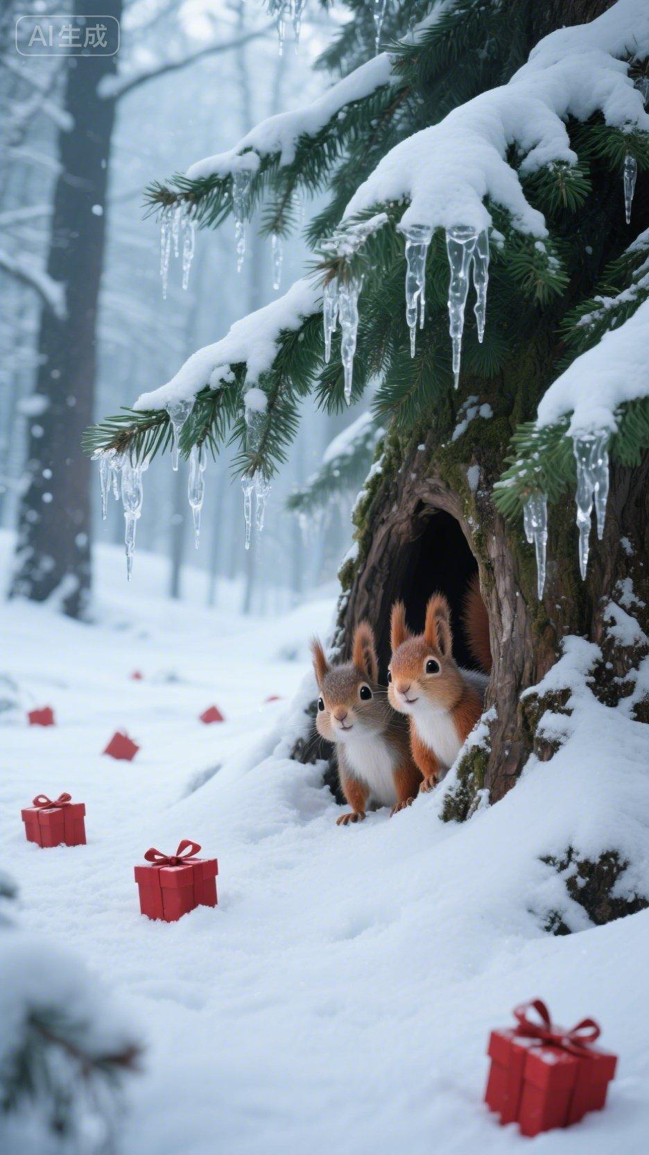 分享一张雪景图 琼枝覆雪凝冰挂,稚兽探头觅岁华