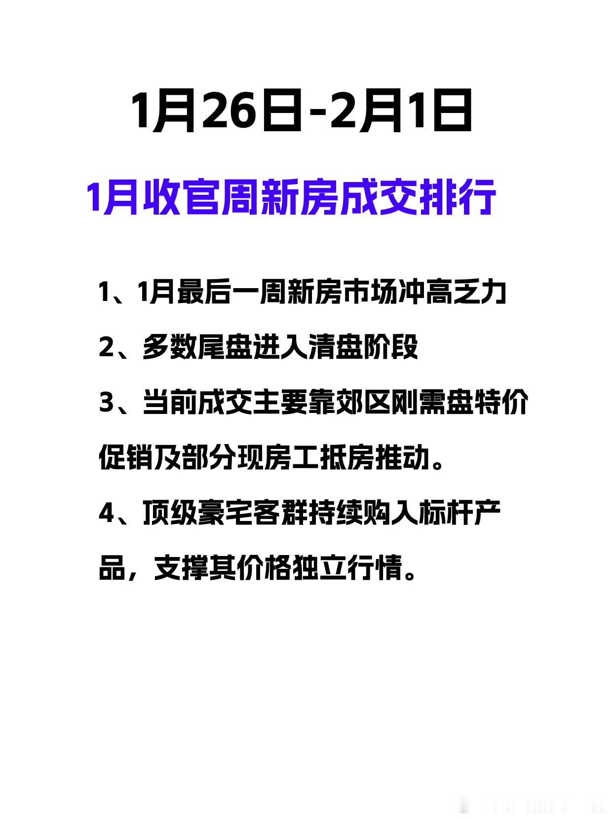 1、1月最后一周,新房并没有出现月度收官冲刺的态势全市新房仅成交261套,环比略有下滑2、多数尾盘新盘,正式步入清盘期,未来客户会逐步感受到卖压3、郊区刚需盘继续特价换量,部分现房新盘工抵房积极转网签4、顶级豪宅的客户,依旧买入全市和板块最顶级业态产品让上述顶豪和地缘顶豪项目,继续走出独立价格行情