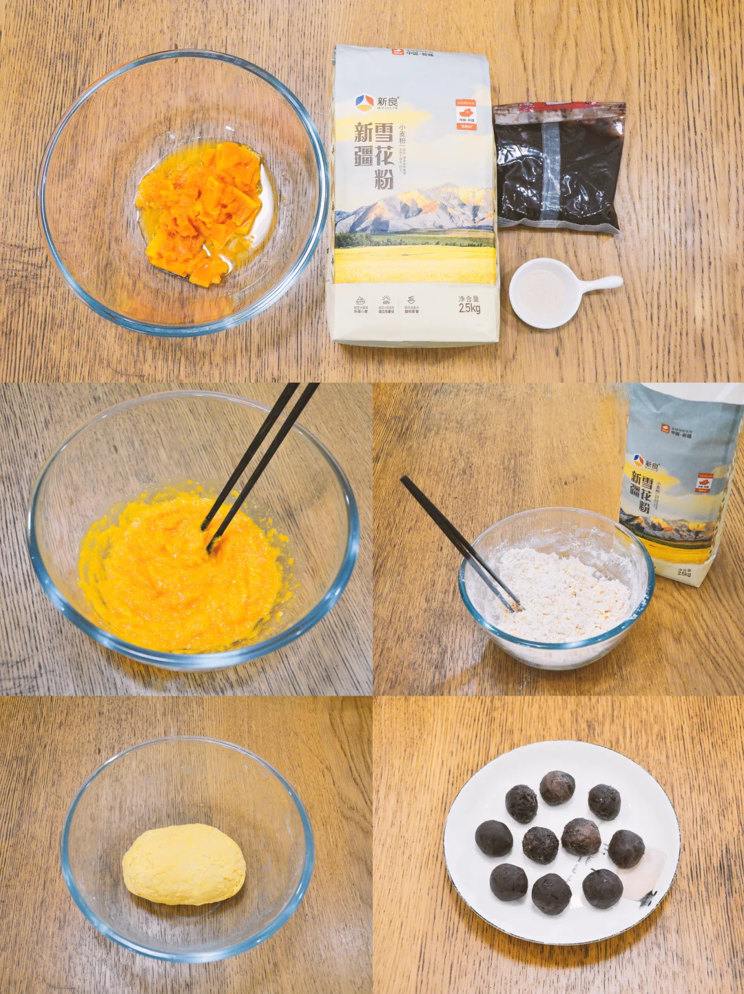 1. 蒸熟晾凉的南瓜泥加干酵母、面粉搅拌成絮状,揉成团饧10-15分钟;