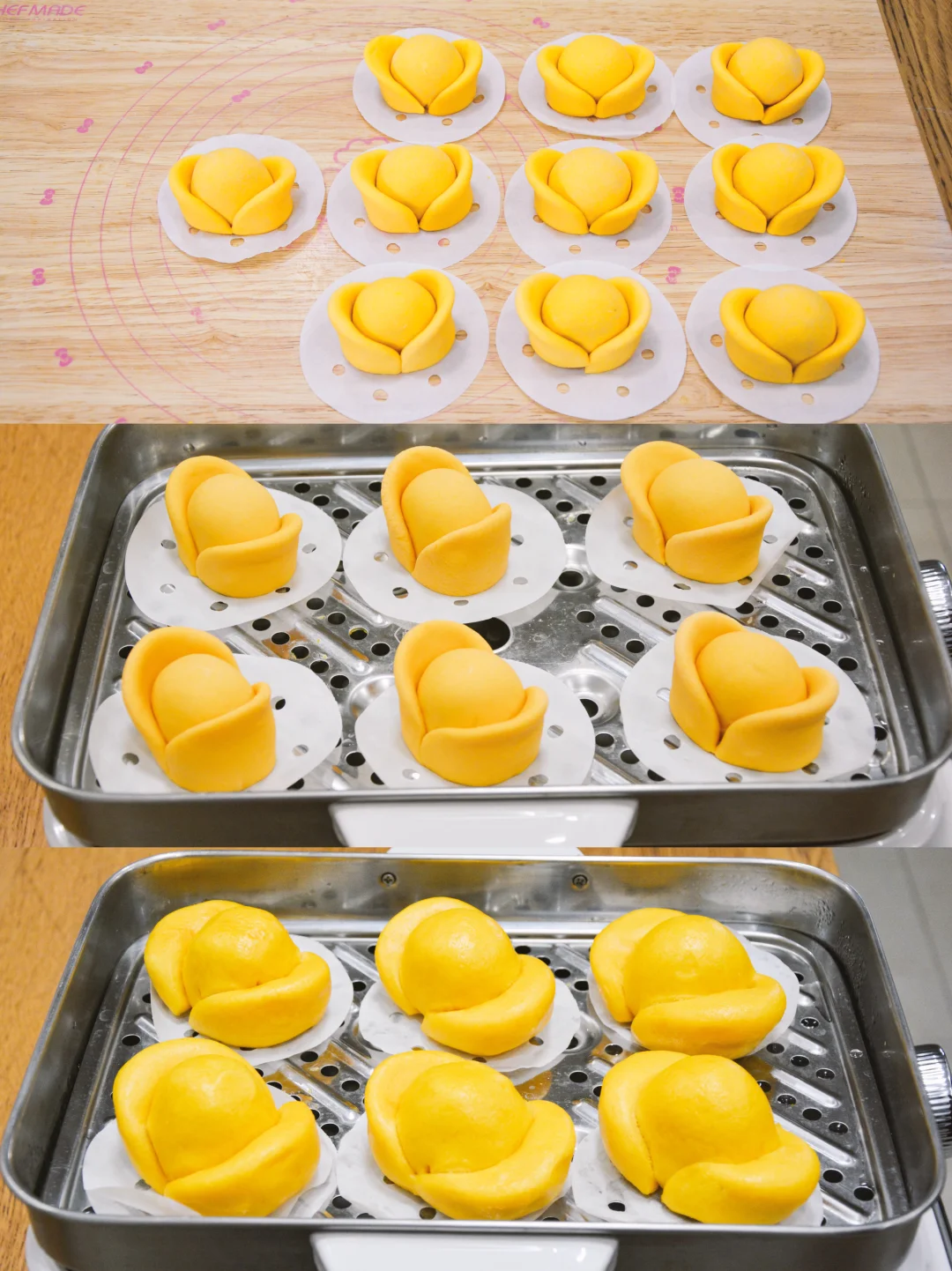 6. 放入温水蒸锅,发酵至1.5倍大,开大火,水开蒸20分钟,闷3分钟。