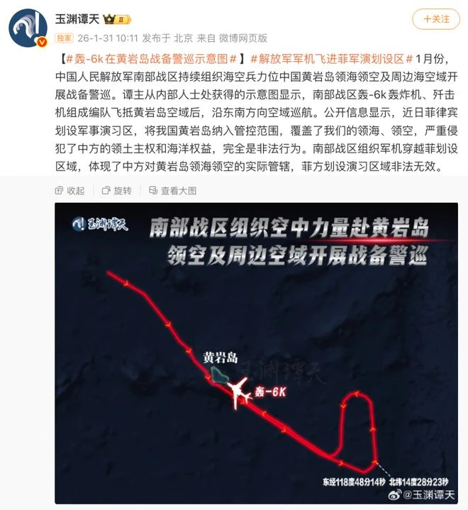 【独家】就在菲律宾军方宣布将于1月21日至3月31日在南海划设大规模军事演习区域,并将中国黄岩岛(菲称“斯卡伯勒浅滩”)纳入其所谓“管控范围”的当天(1月31日),中国人民解放军南部战区果断亮剑,组织海空兵力开展战备警巡。 行动的核心亮点是: 轰-6K轰炸机与歼击机编队飞抵黄岩岛空域后,沿东南方向空域巡航,直接穿越了菲律宾划设的“演习禁区” 。 这一行动迅速引爆舆论,被网友称为“教科书式反制”。