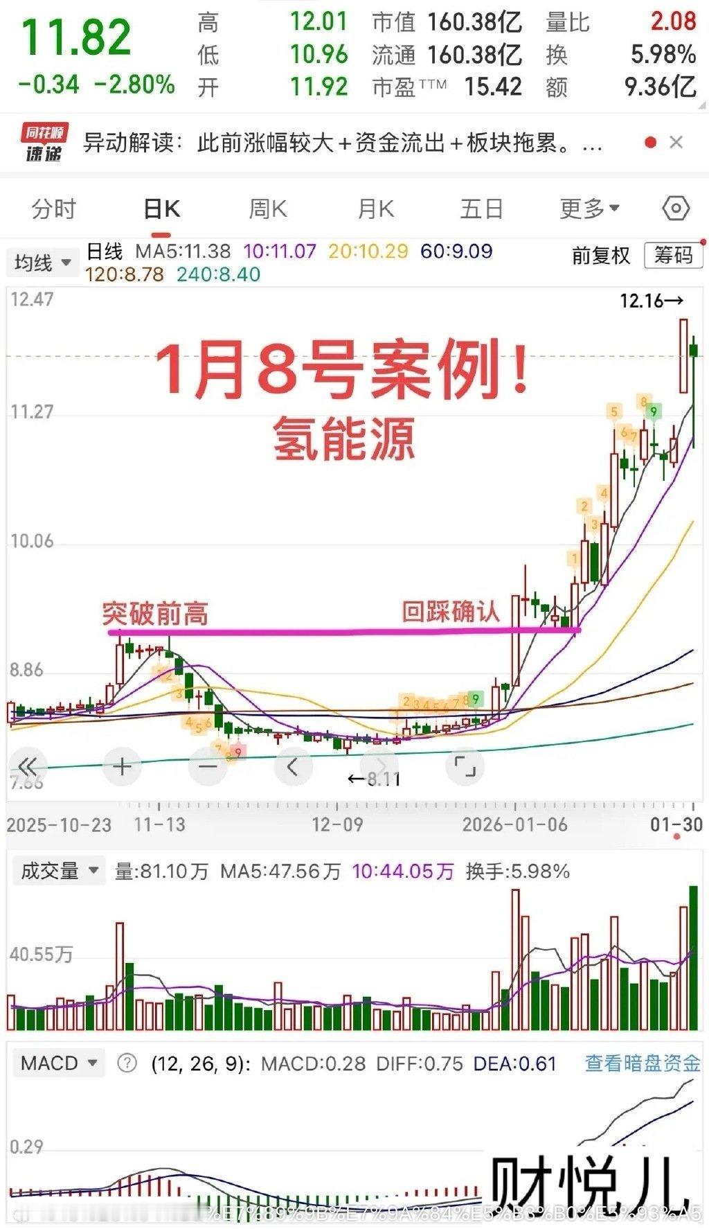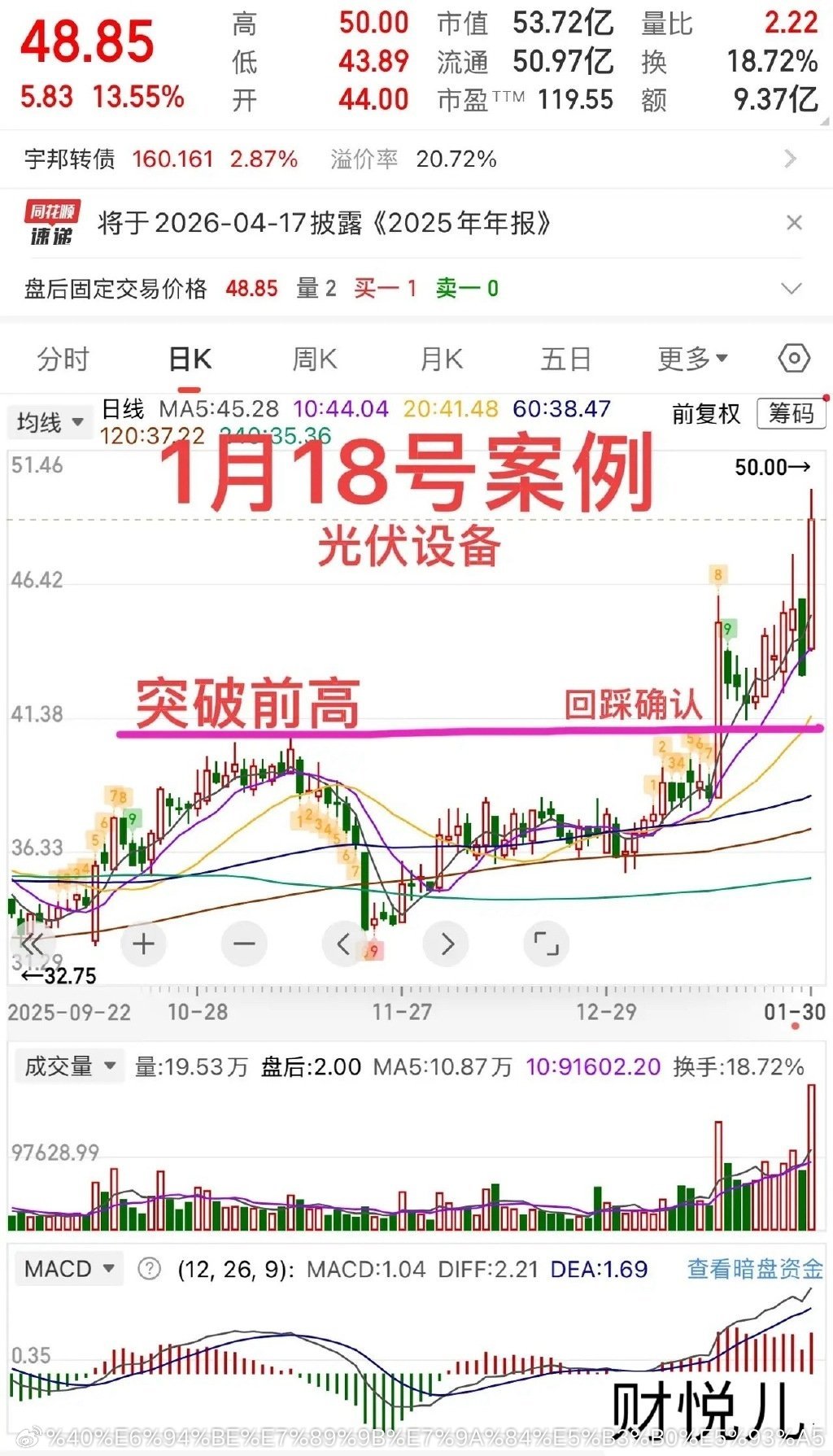 这种成功的案例太多了,就是一个模样刻出来的,一样一样的。图3所示⬇️《氢能源》图3这个案例1月8号给的,我就问大家一句话,是不是《突破形态》战法?首板涨停突破,回踩不破关键点,小k线震荡横的住,大家可以看看都已经上天了,这不就是技术分析出来的吗?《环氧丙烷》图4这个案例是12月29号给的,是不是一样一样的?大阳线突破前高压力,小k线回踩确认,不破关键点横的住(中枢)是不是也上天了现在?《光伏设备》图5这个案例是1月18号给的,是不是符合《形态突破》战法?回踩不破前高,小k线回踩横的住(中枢),周五大涨!