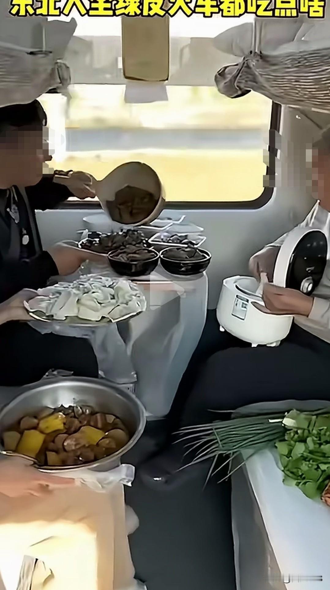 好家伙,电饭锅,盆,都拿来了,东北大爷坐火车,差点把家都搬来了! 全是吃的,床上,桌子上,摆的满满当当,什么蘸酱菜,香肠,烤鸡,太全了。 这是要把旁边乘客馋哭的节奏吗?