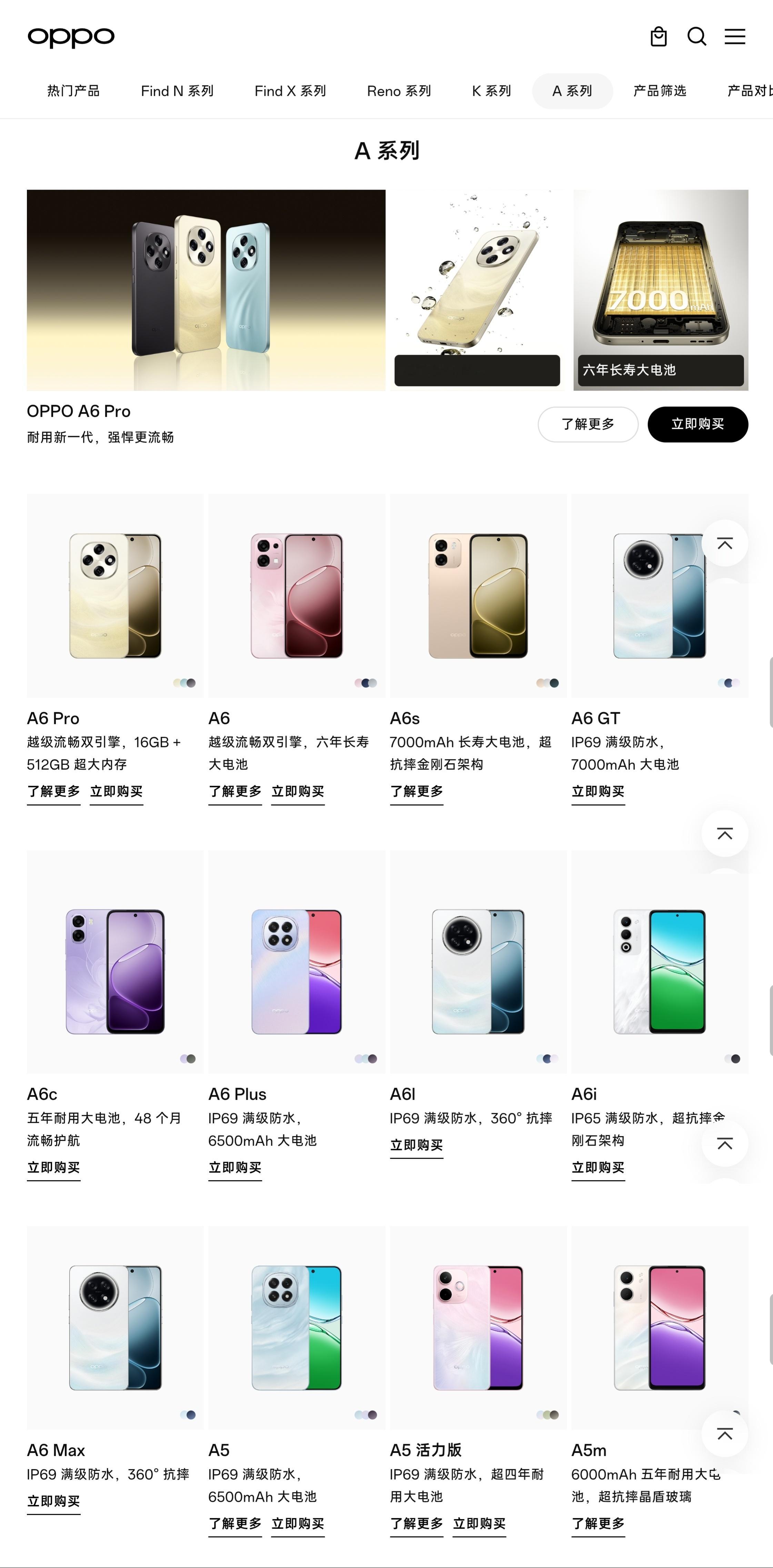 OPPO A6 Pro:天玑 7300OPPO A6:天玑 6300OPPO A6l:骁龙 7Gen3OPPO A6c:骁龙 685OPPO A6i+:天玑 7300OPPO A6v:天玑 7300