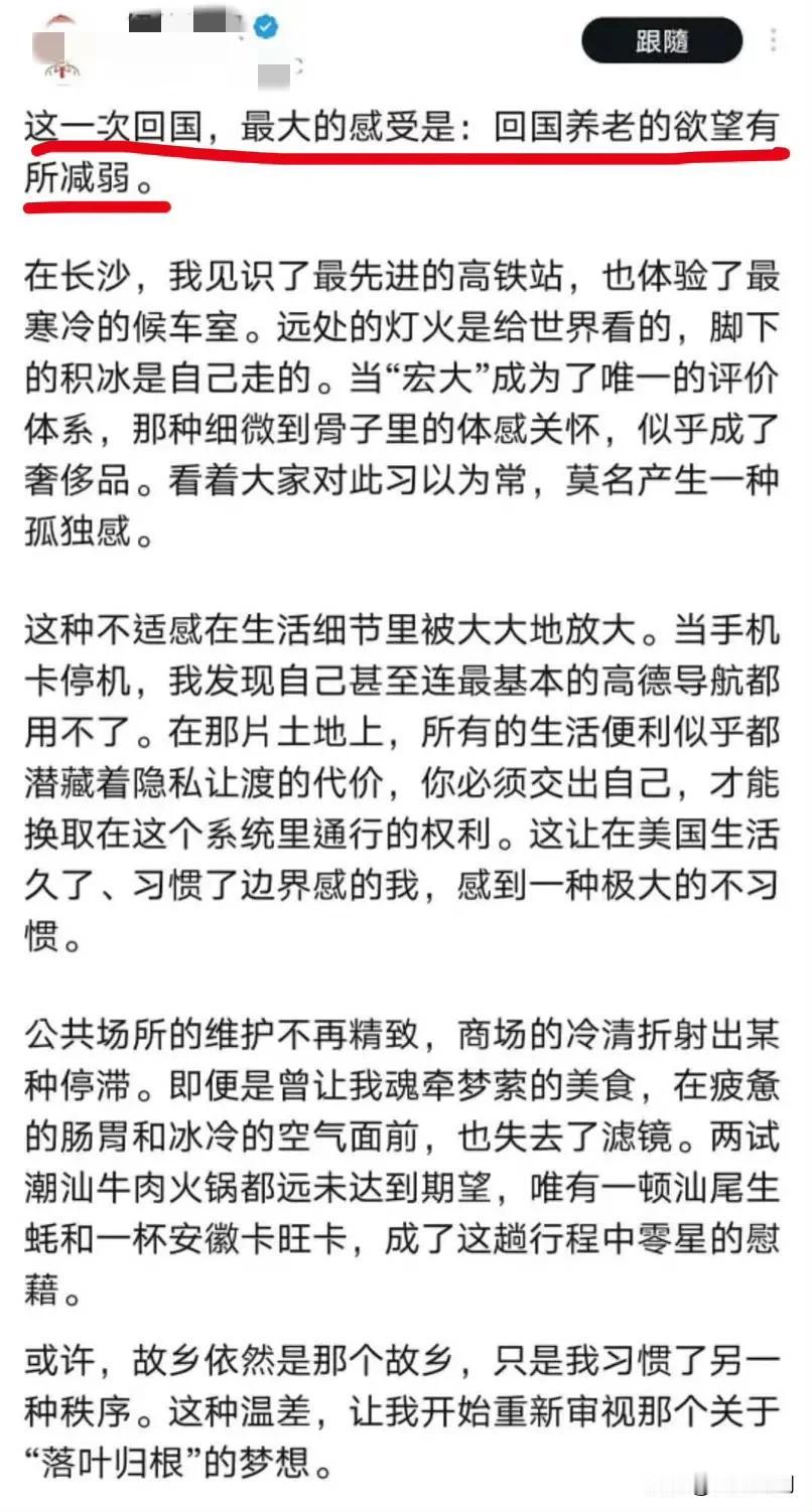 润人回国探亲,称这次回来最大的感受就是让它回国养老的欲望有所减弱,然后长篇大论地把国内各种东西批了一顿! 这种润人以为国内很稀罕它回来养老,你不回来养老,国内民众不知道有多高兴,这些润人,可能有点钱或者有点文化,但总以为它们很重要,好像国内很在乎它们的感受一样,像这些精致的利己主义者,早就臭大街了,如果按照国内大众的意志,早就应该规定不准这些润人回国养老,把自己的青春奉献给国外,然后老了回国来占用国内的养老资源,那凉快去那呆着!