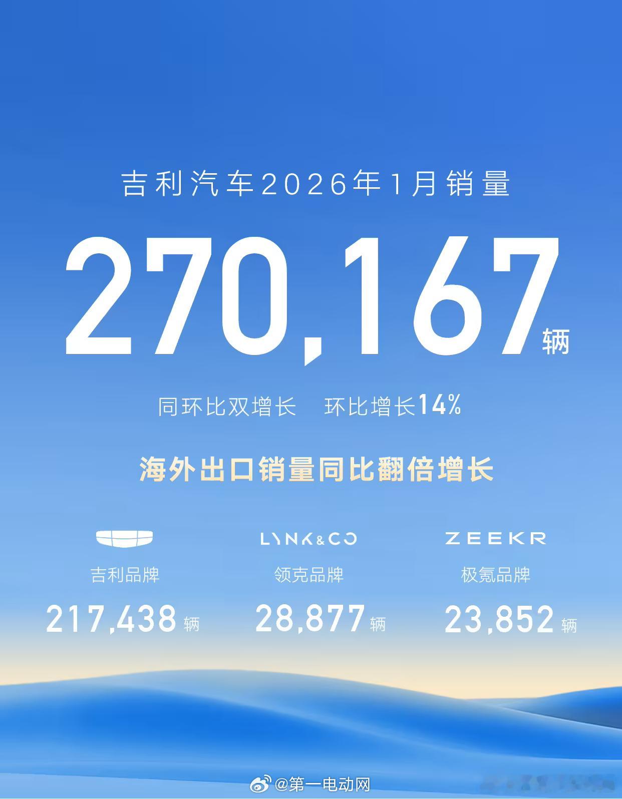 吉利汽车 吉利控股1月销量数据,总销量达到270,167辆,同比增长约1%。其中,出口总销量和极氪品牌总销量均实现翻倍增长。