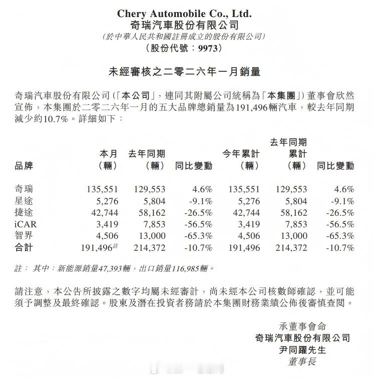 奇瑞集团 2026年1月汽车销量数据,共销售200269辆,其中奇瑞品牌销售191496辆。与2025年1月的224323台销量相比,今年1月销量同比下滑10.72%