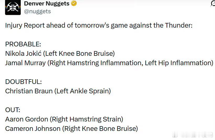 掘金这边——约基奇(左膝盖骨头挫伤)、穆雷(左腿筋发炎,左髋发炎)大概率出战!布劳恩(左脚踝扭伤)出战成疑!